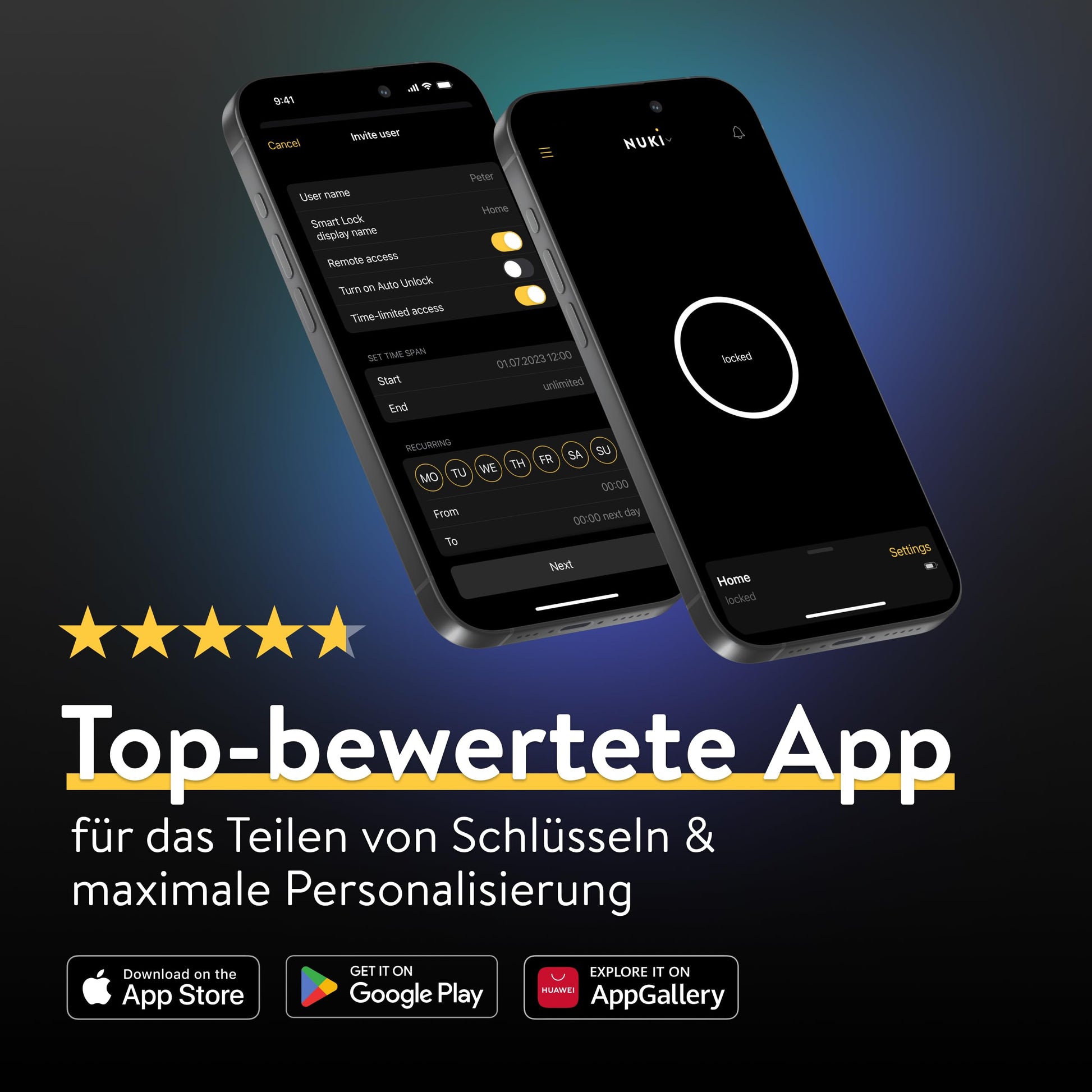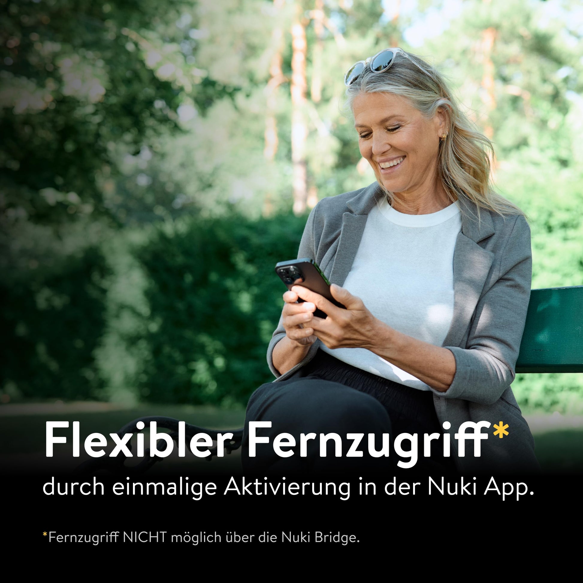 - Integrierter Fernzugriff: Aktivieren Sie den Zugang via WLAN direkt in der Nuki App (einmaliger In-App-Kauf), ohne dass eine separate Bridge oder ein Hub erforderlich ist.