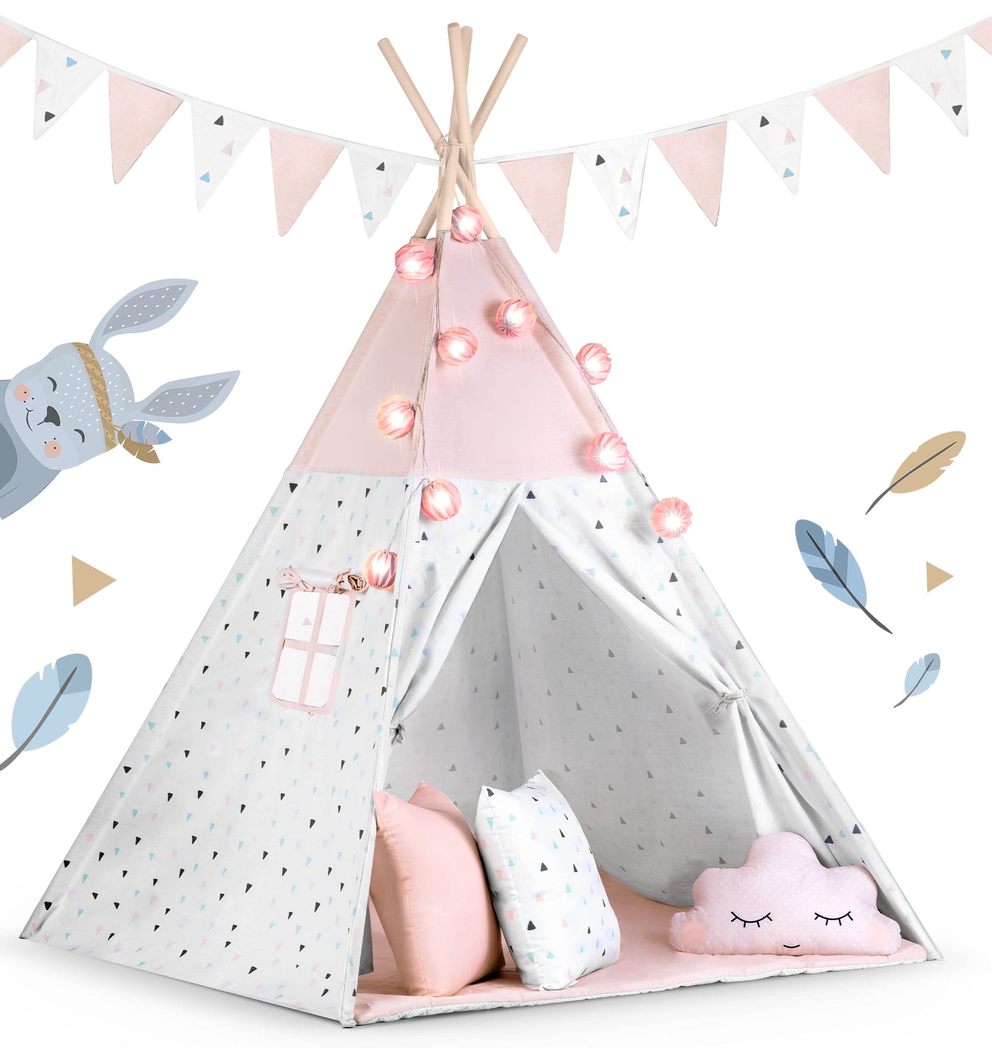 - Komplettes Spielset: Beinhaltet das Zelt, einen Rahmen aus 4 Holzstangen, eine weiche Isoliermatte, 3 gemütliche Kissen, eine dekorative Girlande und eine Lichterkette (Batterien nicht enthalten).