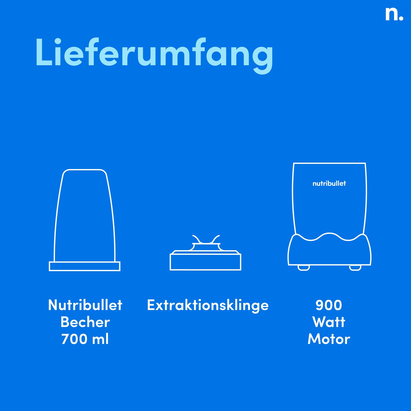 Im Lieferumfang des nutribullet Pro (Modell NB904CP) finden Sie alles, was Sie für den Start benötigen: die 900-Watt-Motorbasis, eine Extraktionsklinge aus rostfreiem Stahl, einen 700 ml To-Go-Becher und einen praktischen Trinkring für den direkten Genuss.