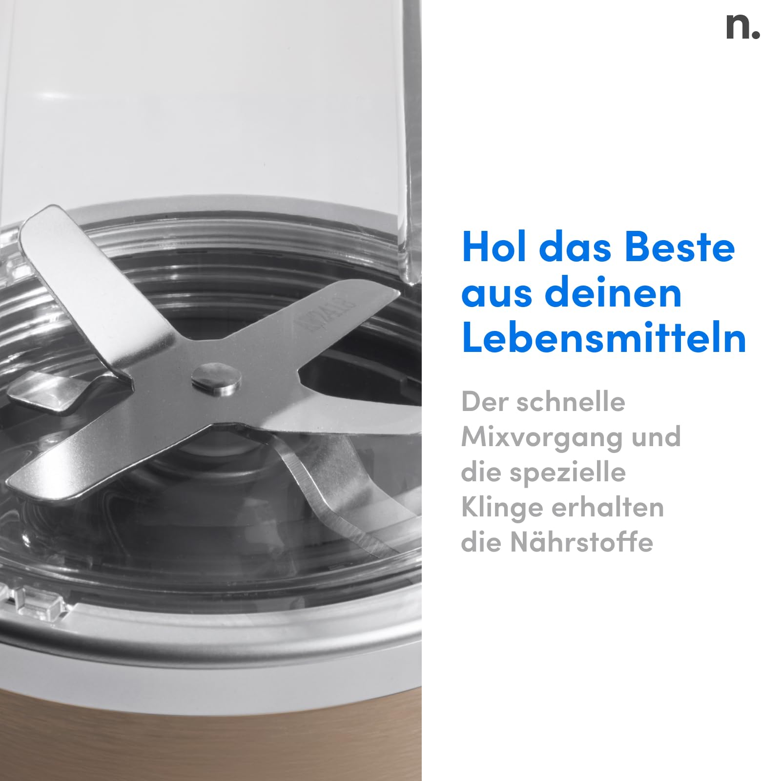 - Leistungsstarker 900-Watt-Motor: Mit einer Drehzahl von 21'000 U/Min. zerkleinert dieser Mixer mühelos auch harte Lebensmittel wie Nüsse oder faserreiches Gemüse wie Grünkohl.