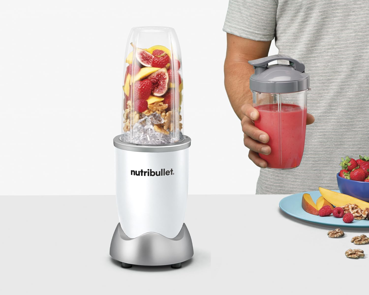 Das Set ist sofort einsatzbereit und enthält die 900-Watt-Motorbasis, die Extraktionsklinge mit sechs Messern aus rostfreiem Stahl, einen grosszügigen 700 ml To-Go-Becher sowie einen passenden Trinkring für den bequemen Genuss unterwegs.