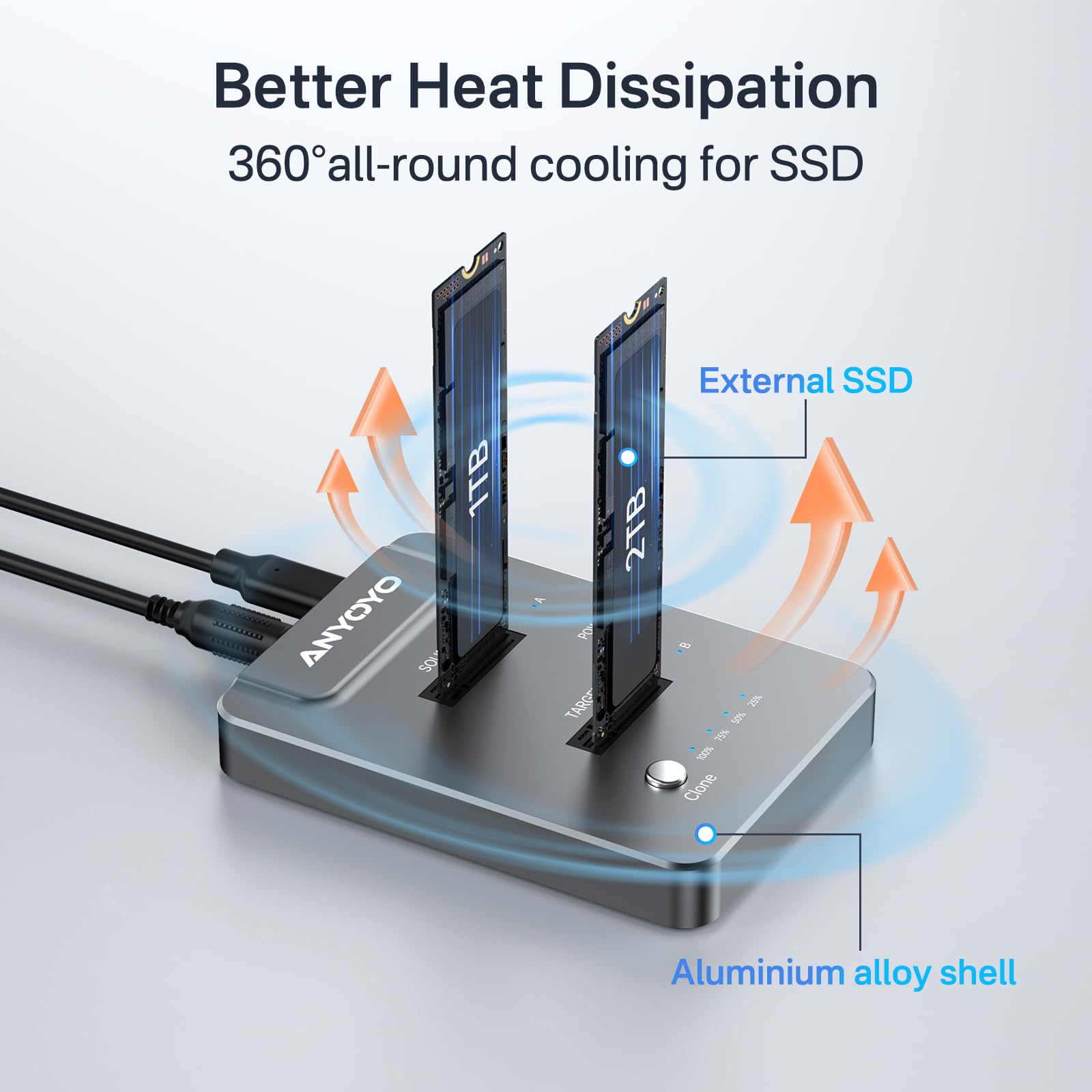 Dieses Gehäuse ist eine leistungsstarke Dual-Bay Docking- und Klonstation, die speziell für M.2 NVMe SSDs entwickelt wurde. Sie ermöglicht das einfache Klonen von Festplatten ohne Computer und dient gleichzeitig als schnelles externes Laufwerk.