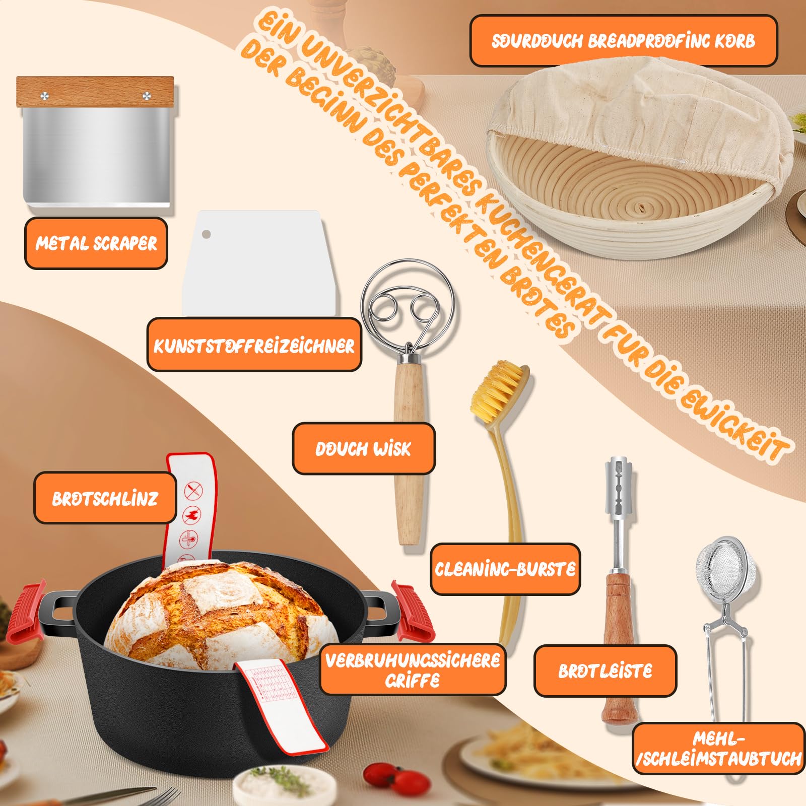 - Komplettes Backzubehör: Das Set beinhaltet alles für den sofortigen Start, darunter einen Brot-Gärkorb (Banneton), einen Teigschaber und weiteres nützliches Zubehör.
