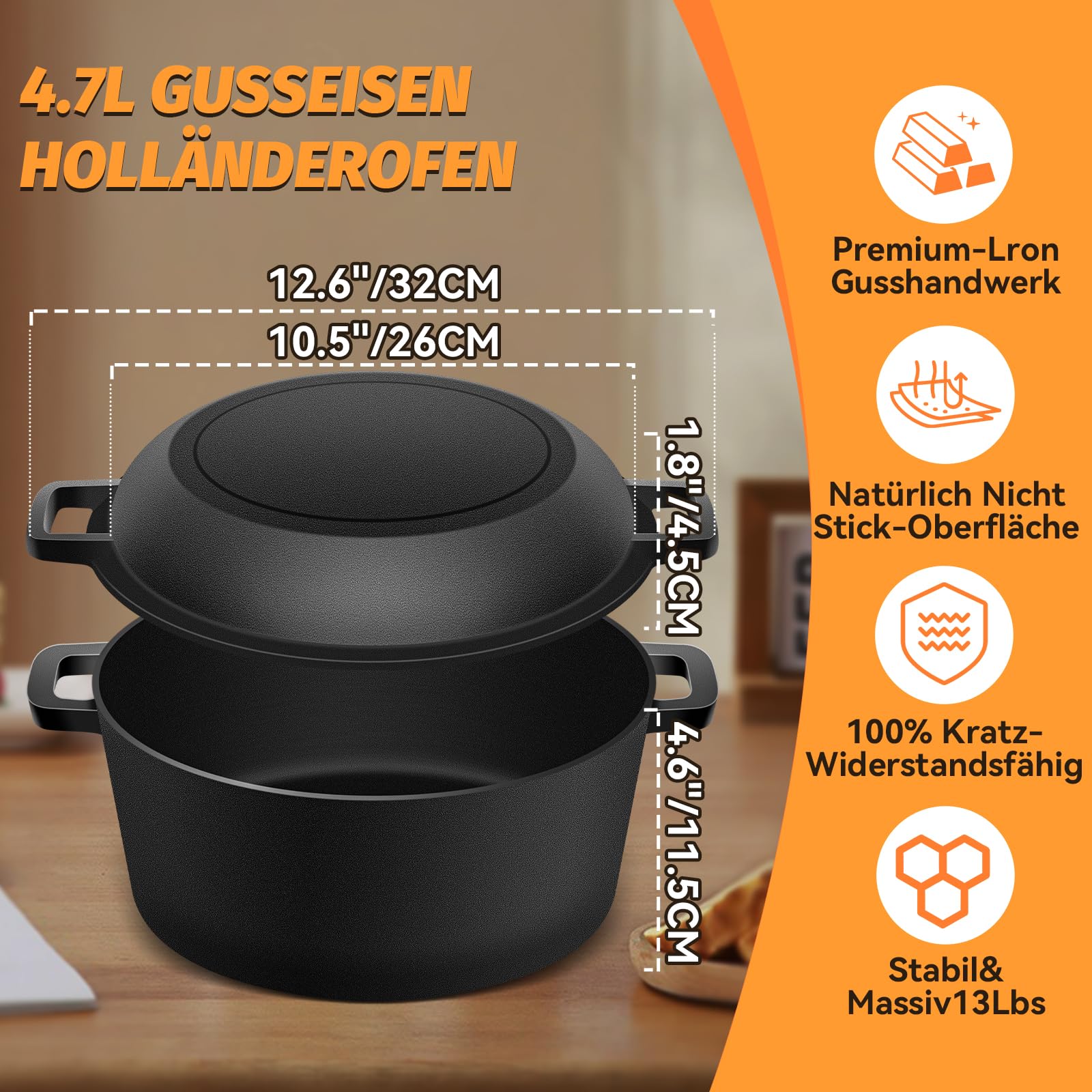 - 2-in-1-Funktionalität: Der 4.7-Liter-Gusseisen-Topf wird mit einem Deckel geliefert, der sich auch als eigenständige Bratpfanne nutzen lässt.