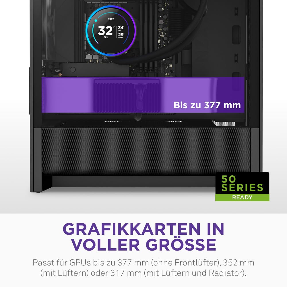 Das H3 Flow ist für moderne High-End-Grafikkarten konzipiert. Es bietet Platz für GPUs mit einer Länge von bis zu 377 mm (ohne Frontlüfter), 352 mm (mit Frontlüfter) oder 317 mm (mit Front-Radiator), was für die meisten leistungsstarken Modelle ausreicht.