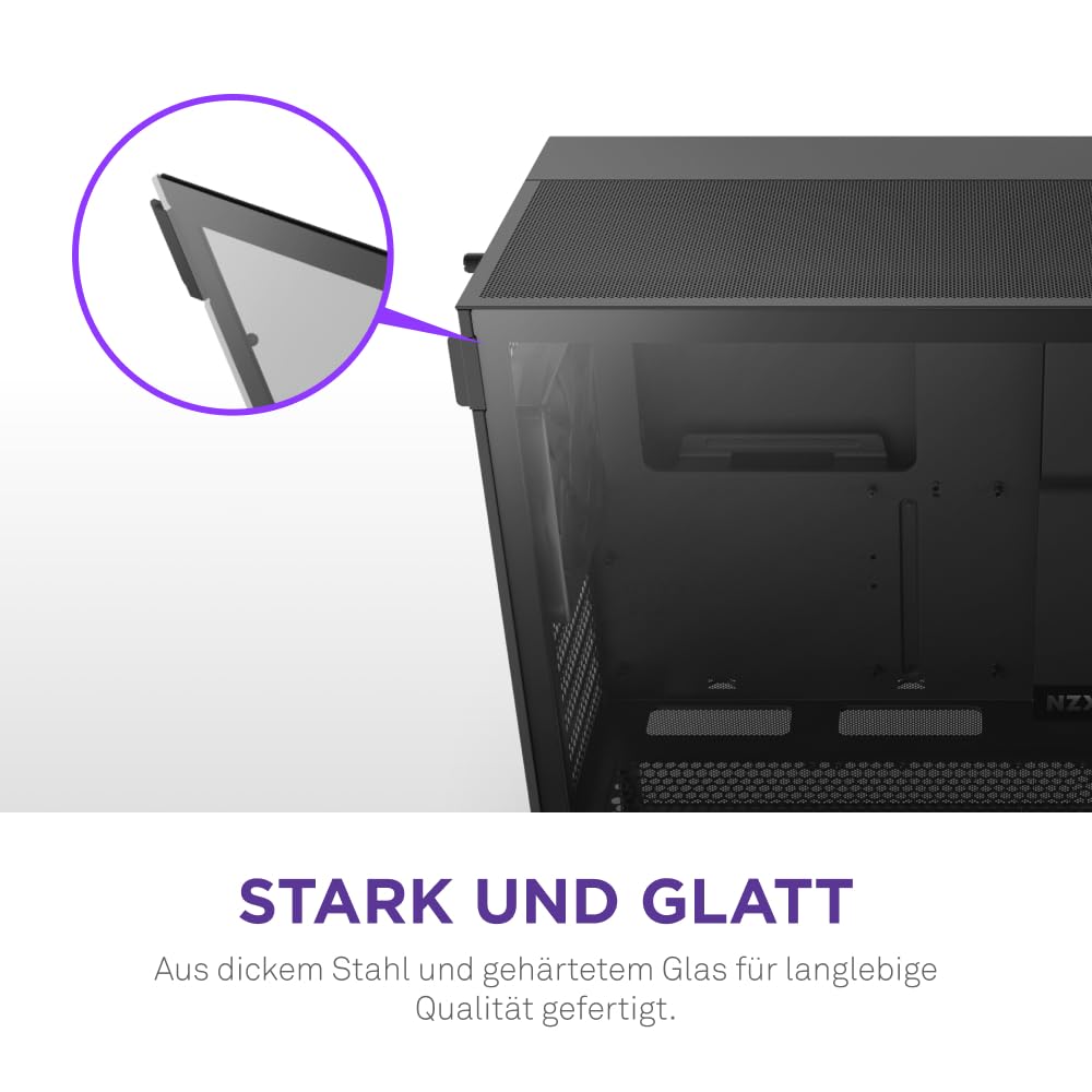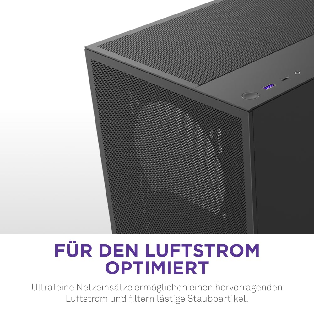 Das H5 Flow ist auf maximalen Luftstrom ausgelegt. Es verfügt über eine perforierte Mesh-Front und -Oberseite sowie eine einzigartige, strategisch platzierte Öffnung am Boden für einen Lüfter, der kühle Luft direkt auf die Grafikkarte leitet, um Hitzestau zu verhindern und die Leistung zu maximieren.