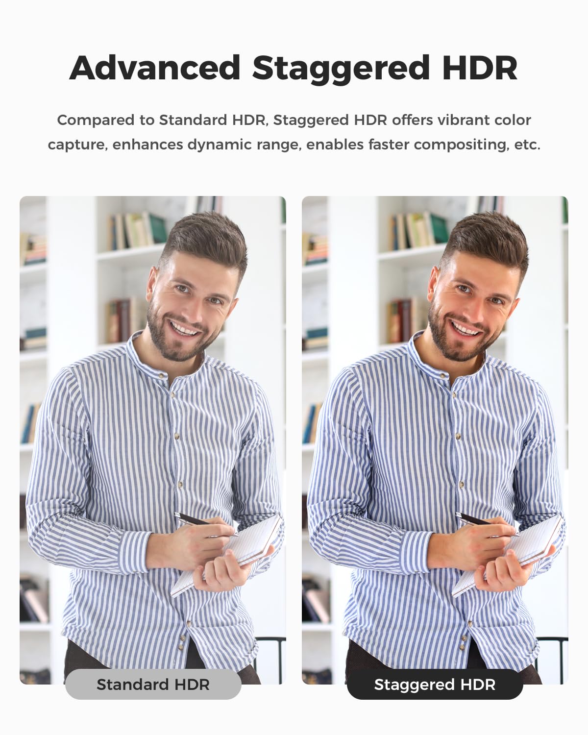 Dank ihres fortschrittlichen 1/2,8-Zoll Stacked CMOS-Sensors in Kombination mit Staggered HDR und einem grossen Dynamikumfang liefert die Webcam selbst bei schwieriger Beleuchtung eine exzellente und klare Videoqualität, sodass Sie in Meetings und Streams immer professionell aussehen.