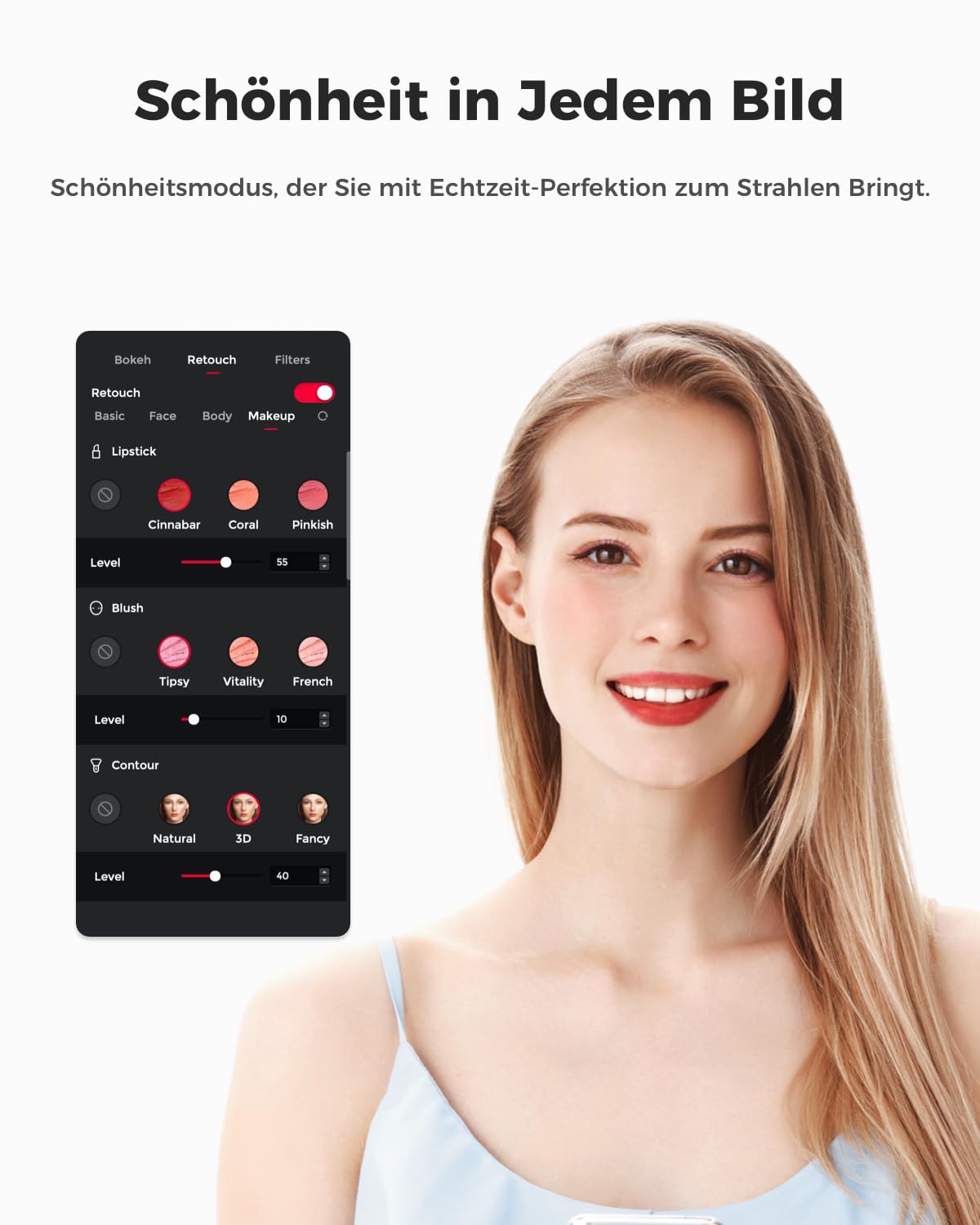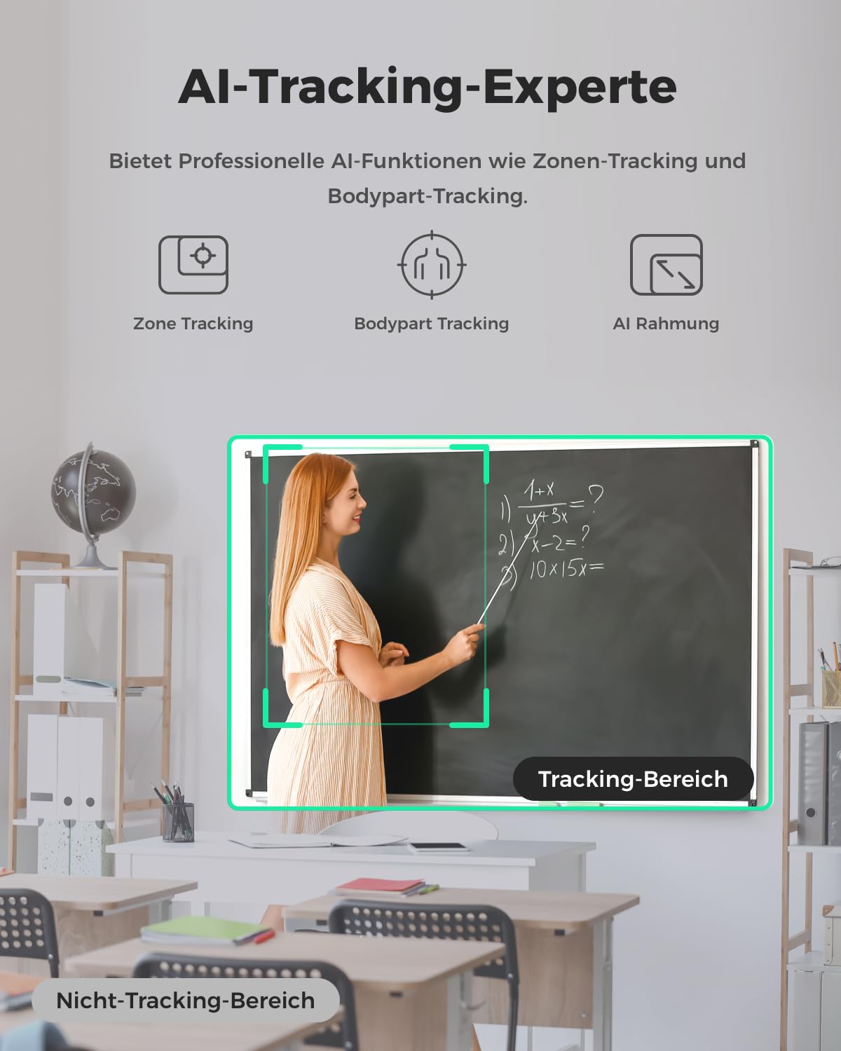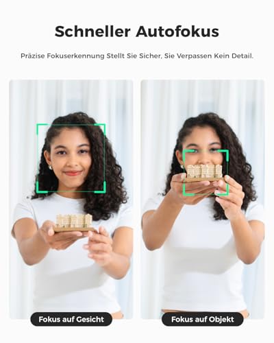 - Intelligentes AI-Tracking: Die Kamera folgt Ihnen automatisch und passt den Bildausschnitt dynamisch an. Dank fortschrittlicher Bodypart AI, die Oberkörper, Hände und mehr erkennt, bleiben Sie oder Ihre Gruppe stets perfekt im Fokus – ganz ohne manuelle Anpassung.