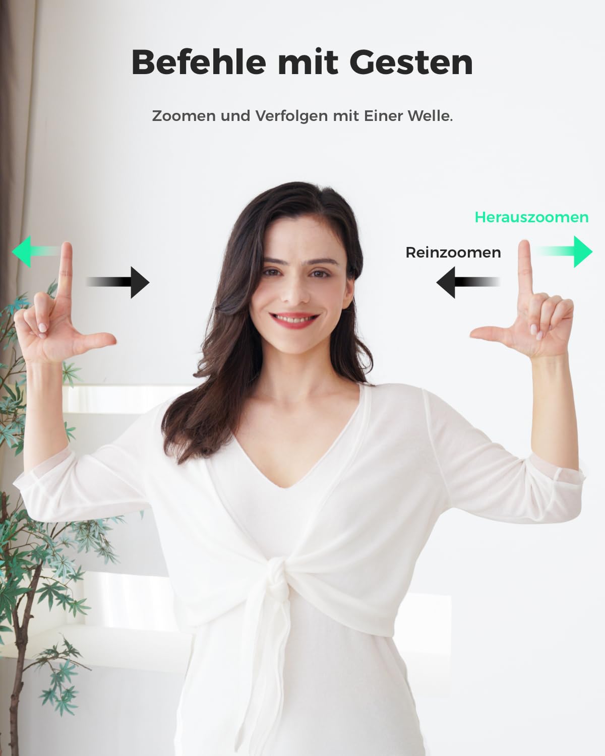 - Intuitive Gestensteuerung: Steuern Sie die Kamera mühelos mit einfachen Handzeichen. Aktivieren Sie das Tracking mit einer offenen Hand (🖐) oder zoomen Sie nahtlos an ein Objekt heran, indem Sie mit dem Finger darauf zeigen (👆) – für eine direkte und unkomplizierte Bedienung.