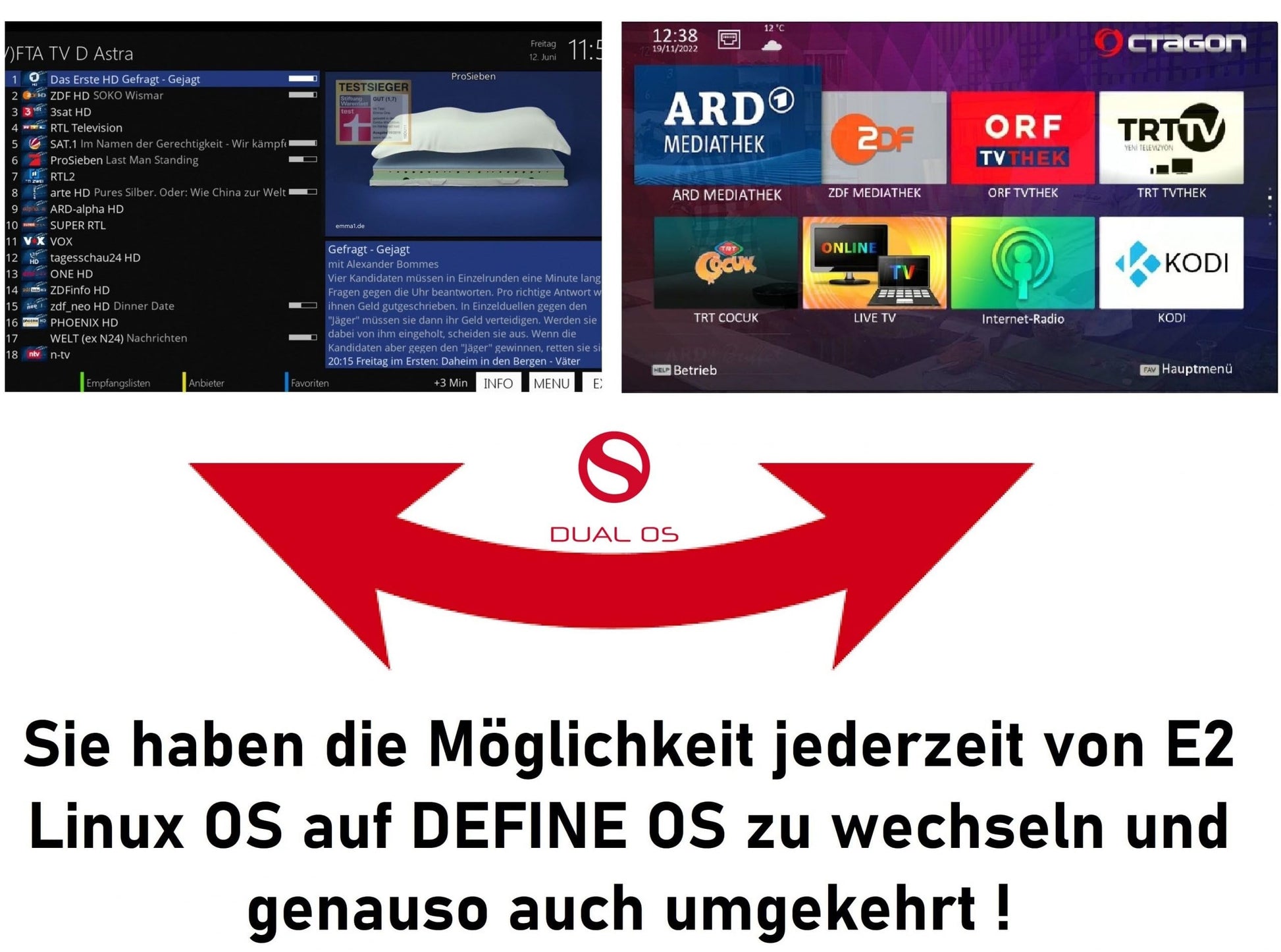 Der Receiver bietet mit seiner Multiboot-Funktion beide Optionen. Define OS ist besonders benutzerfreundlich und ideal für Einsteiger. E2 Linux hingegen ist extrem vielseitig und durch unzählige Plugins (Skins, Apps) anpassbar, was es zur perfekten Wahl für Technik-Enthusiasten macht. Sie können jederzeit zwischen den Systemen wechseln.