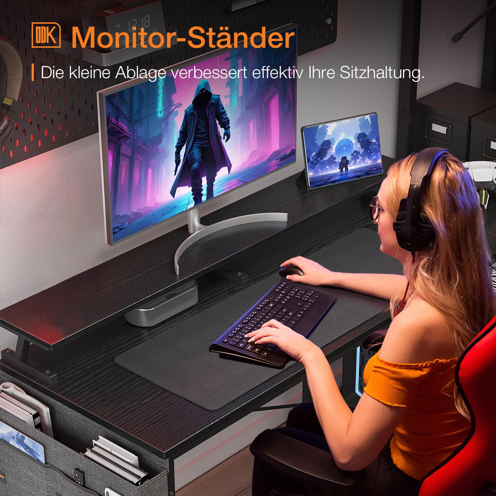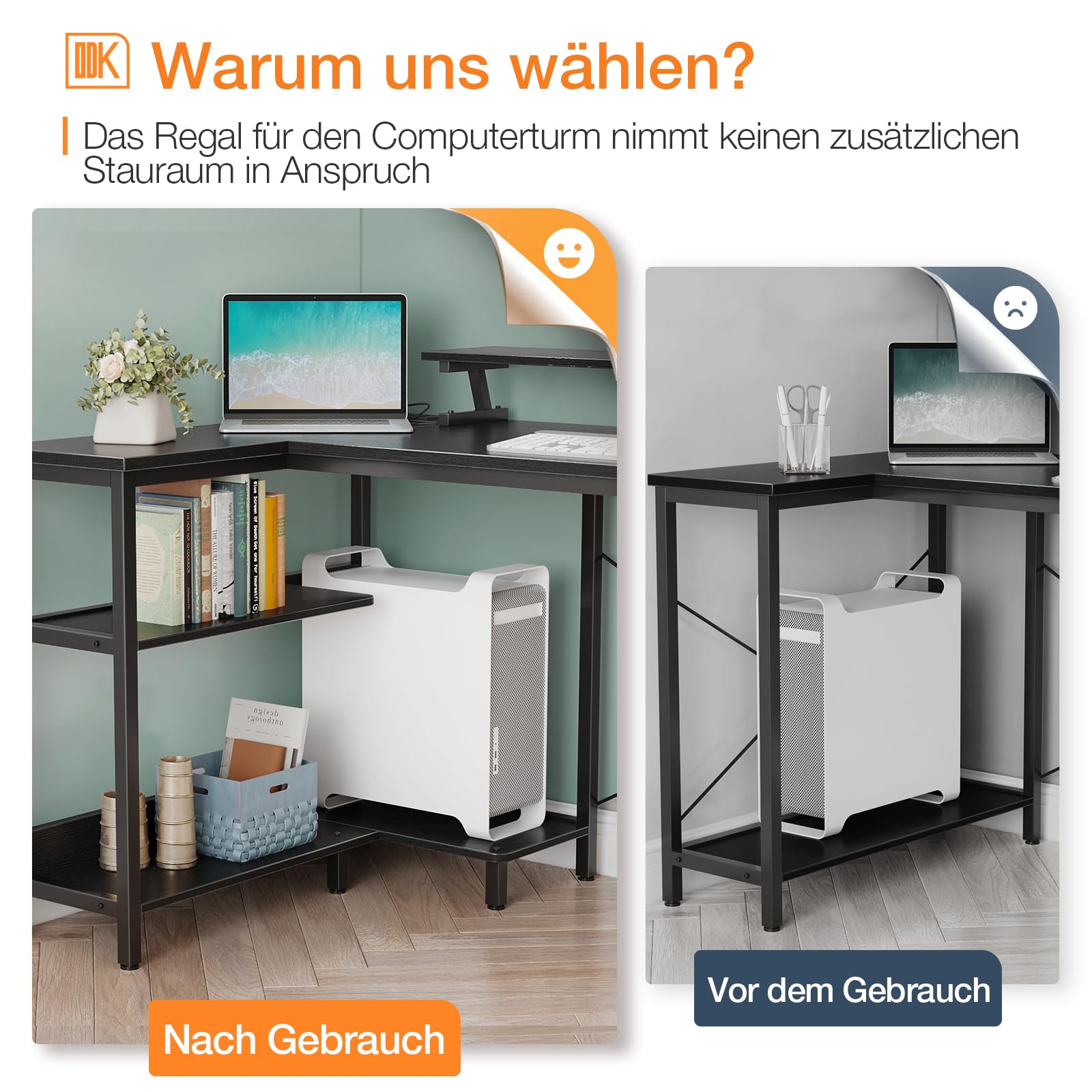 - Grosszügiger Stauraum: Eine grosse Tischplatte sowie ein flexibel montierbares Regal bieten ausreichend Platz für Monitore, PC-Gehäuse, Bücher und Zubehör.