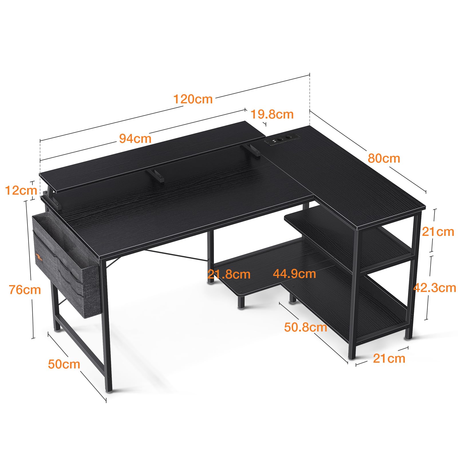 Der Schreibtisch hat die Masse 120 x 80 cm. Durch sein L-förmiges Eckdesign ist er besonders platzsparend und eignet sich hervorragend, um Ecken in kleineren Räumen, im Heimbüro oder in Gaming-Zimmern optimal auszunutzen und die verfügbare Arbeitsfläche zu maximieren.
