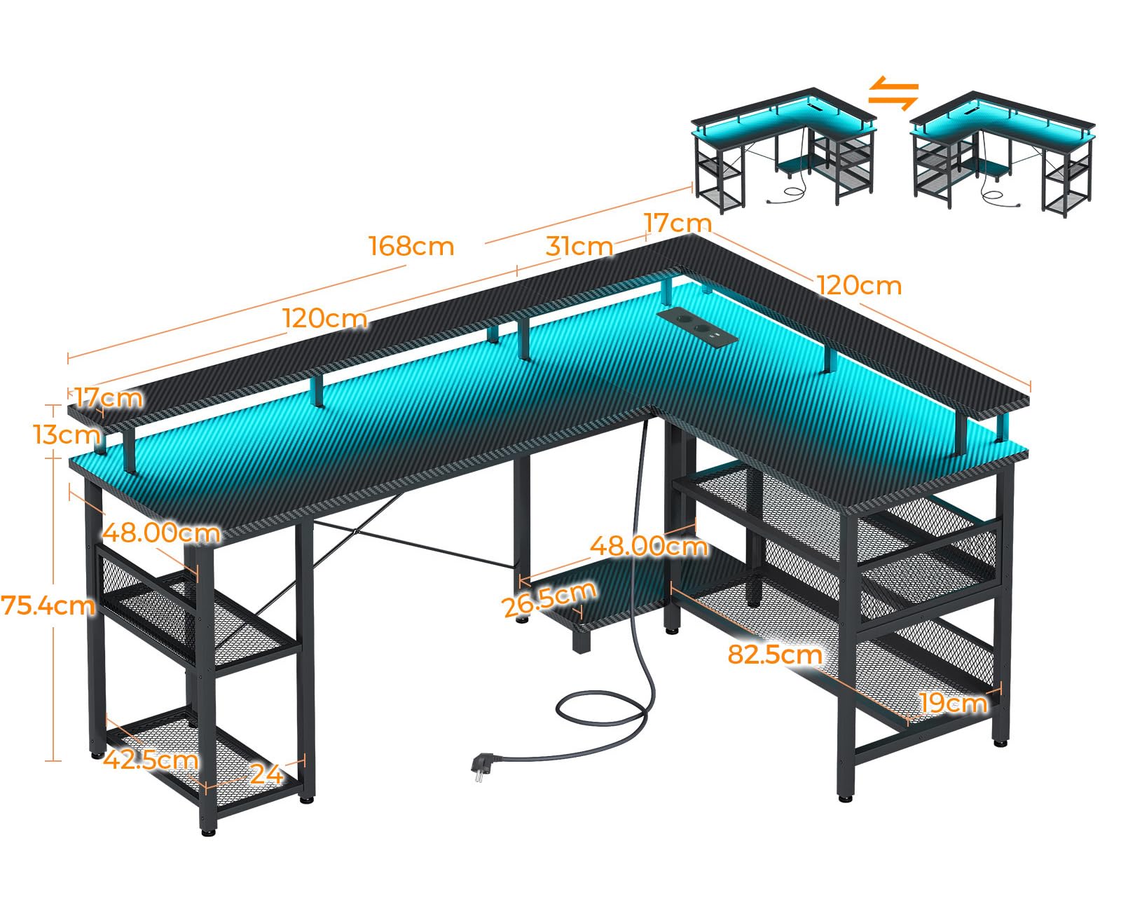- Ergonomische L-Form: Die grosszügige Tischoberfläche in Kohlefaser-Optik bietet massiv Platz und Beinfreiheit, während der extralange Monitorständer eine gesunde Haltung fördert.