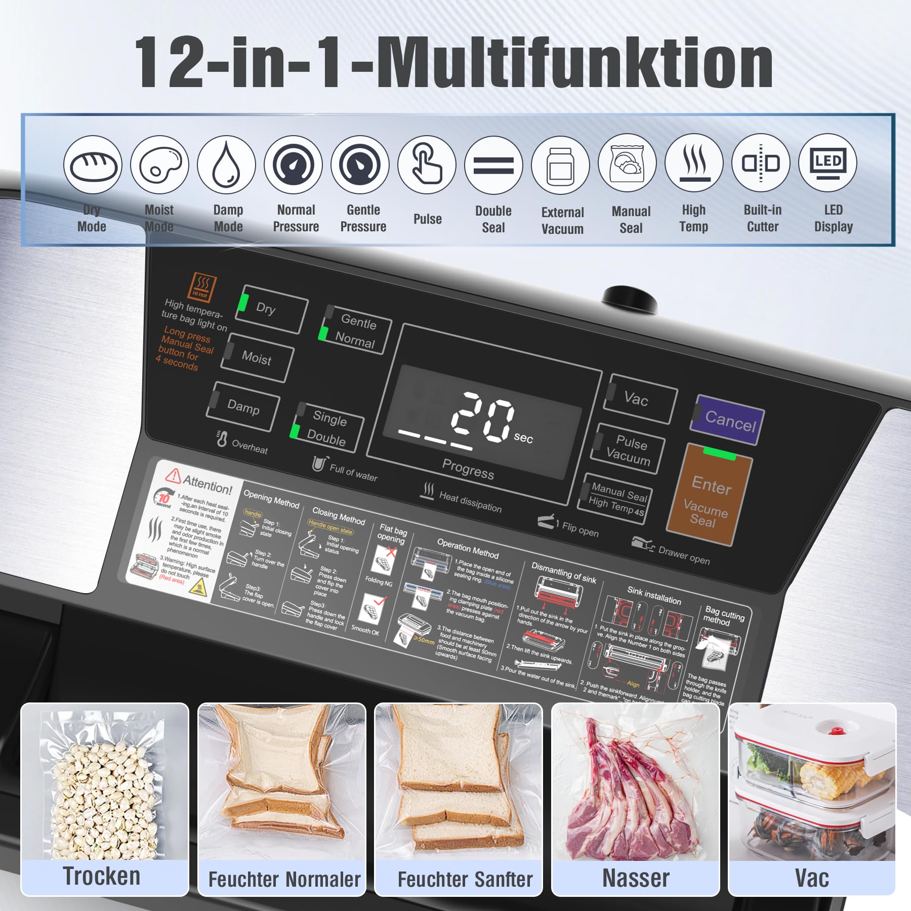 - Vielfältige Modi: Wählen Sie je nach Lebensmittel zwischen Einstellungen für trockene, feuchte oder nasse Produkte sowie normalem oder sanftem Vakuumdruck. Ein Puls-Modus erlaubt die volle manuelle Kontrolle.
