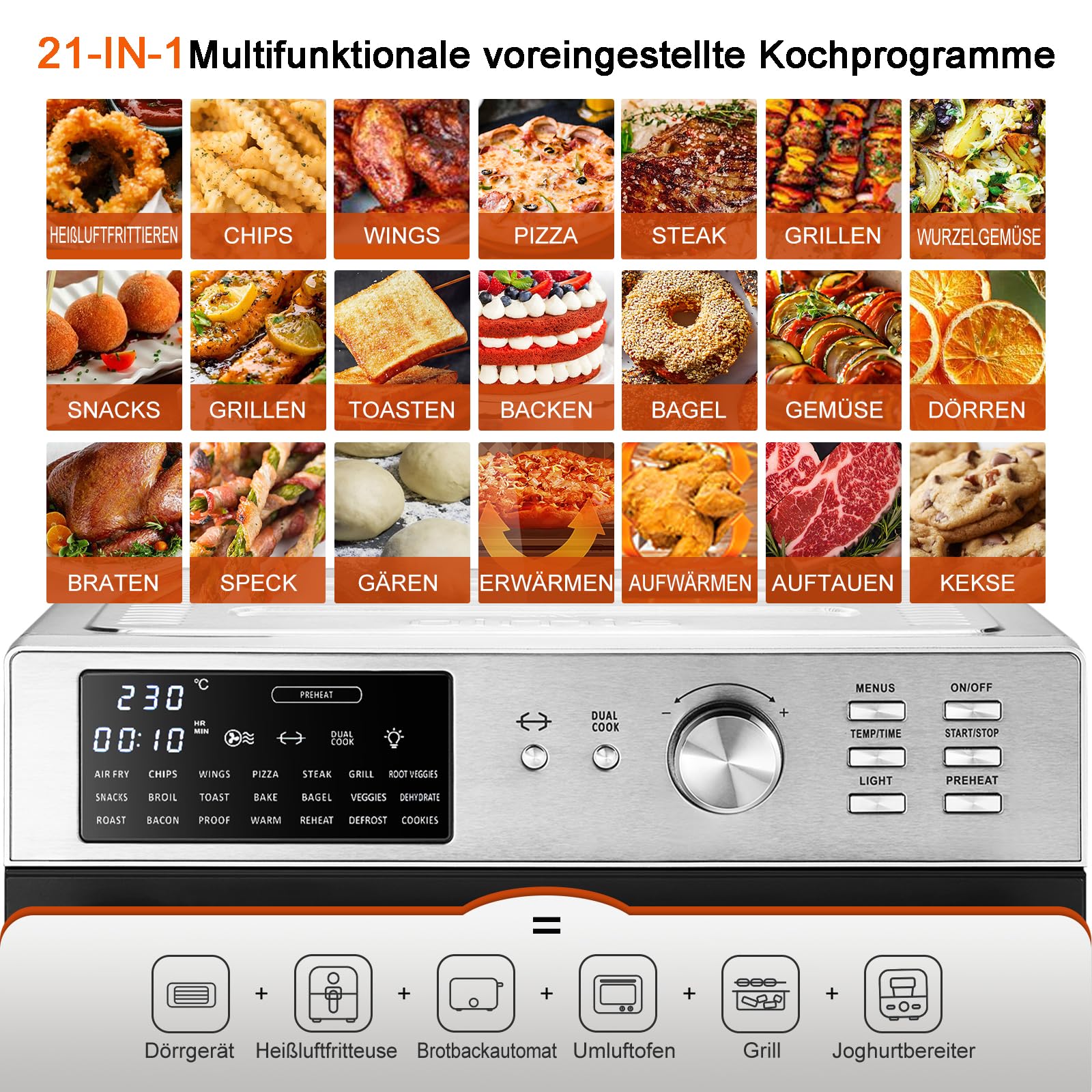 - Intuitive Bedienung mit 21 Programmen: Ein klares LED-Display mit Drehknopf und Tasten sorgt für eine kinderleichte Steuerung. Wählen Sie aus 21 Voreinstellungen für Fleisch, Fisch, Pommes frites und mehr.
