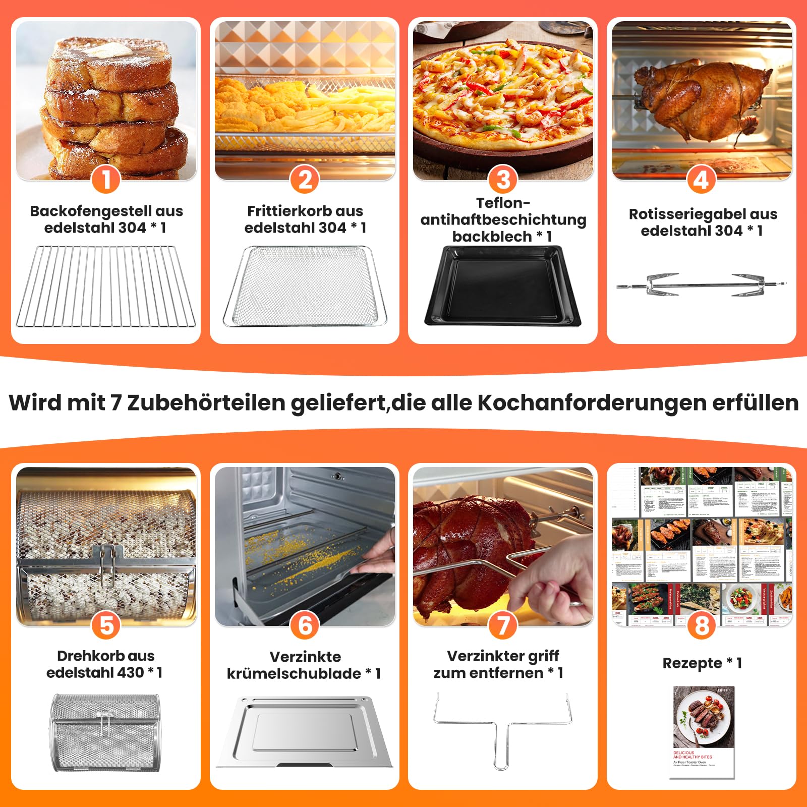 Das Gerät wird mit einem umfangreichen 7-teiligen Zubehörset geliefert: Backform, Luftfrittierkorb, Gitterrost, Drehspiess, Drehkorb, eine Entnahmehilfe und eine praktische Krümelschublade. Ein Rezeptbuch für den sofortigen Start ist ebenfalls dabei.