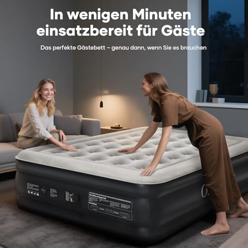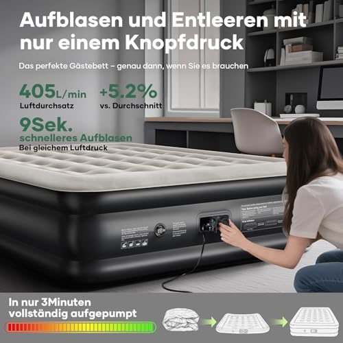 Dank der integrierten elektrischen Pumpe ist die Matratze in nur 3 bis 4 Minuten vollständig aufgeblasen und einsatzbereit. Der Abbau gestaltet sich ebenso schnell und unkompliziert, was sie ideal für spontane Gäste oder Campingausflüge macht.