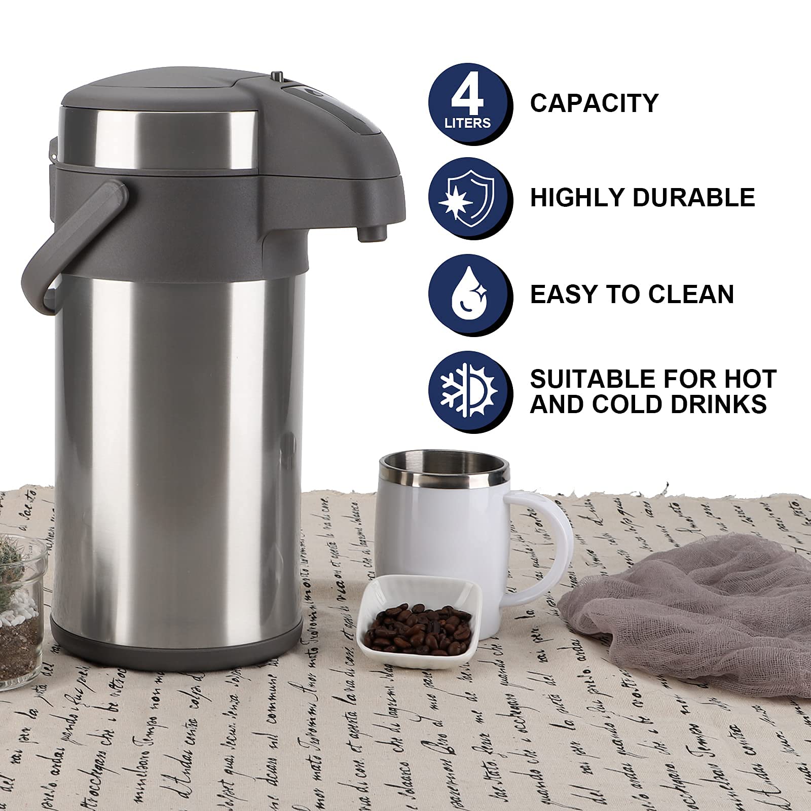 Diese grosszügige 4,0-Liter-Pumpkanne ist der ideale Getränkespender für Anlässe, bei denen über längere Zeit heisse oder kalte Getränke für mehrere Personen bereitstehen sollen.