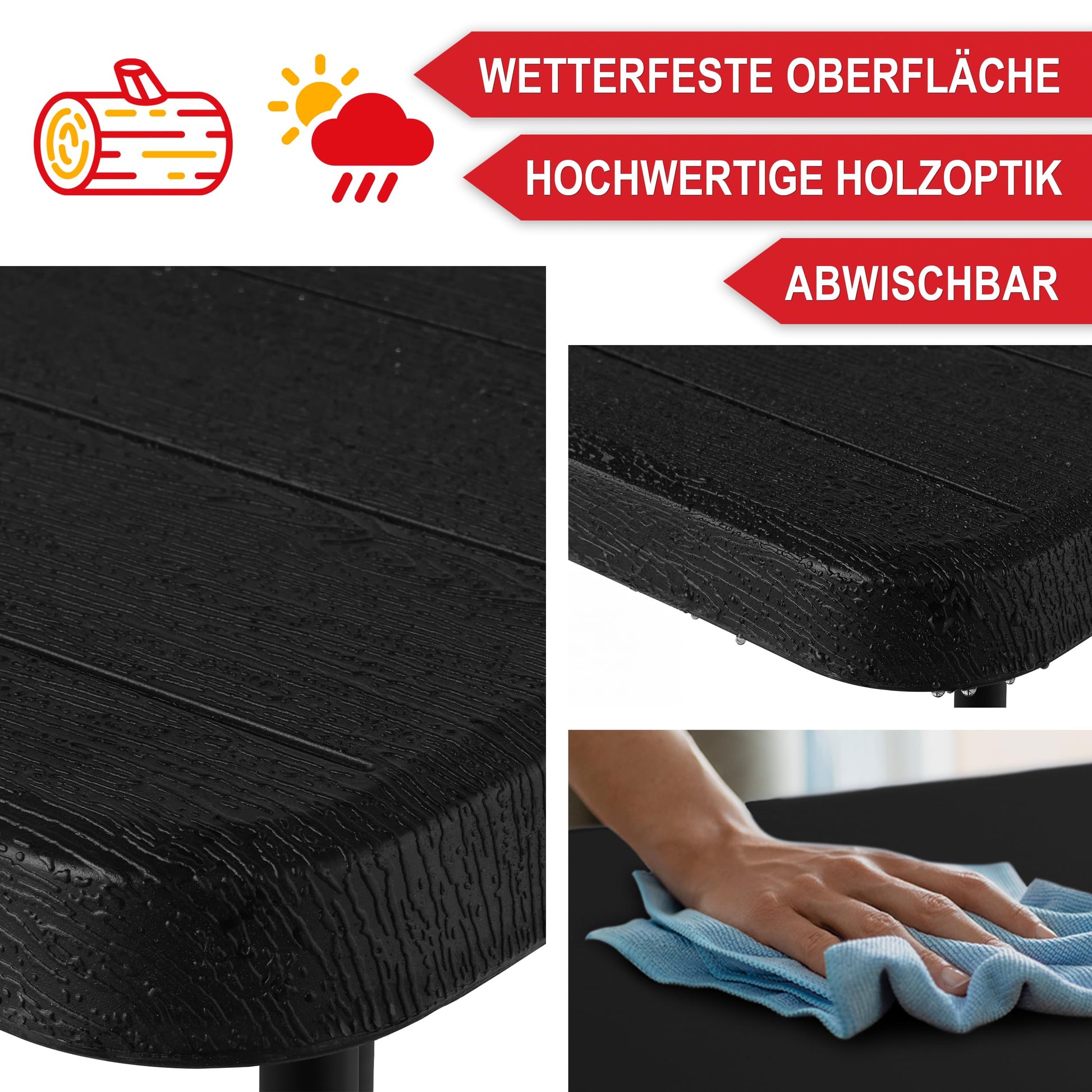- Wetterfeste Materialien: Die Tischplatte aus UV- und witterungsbeständigem Kunststoff in Holzstruktur ist robust und sehr einfach zu reinigen.
