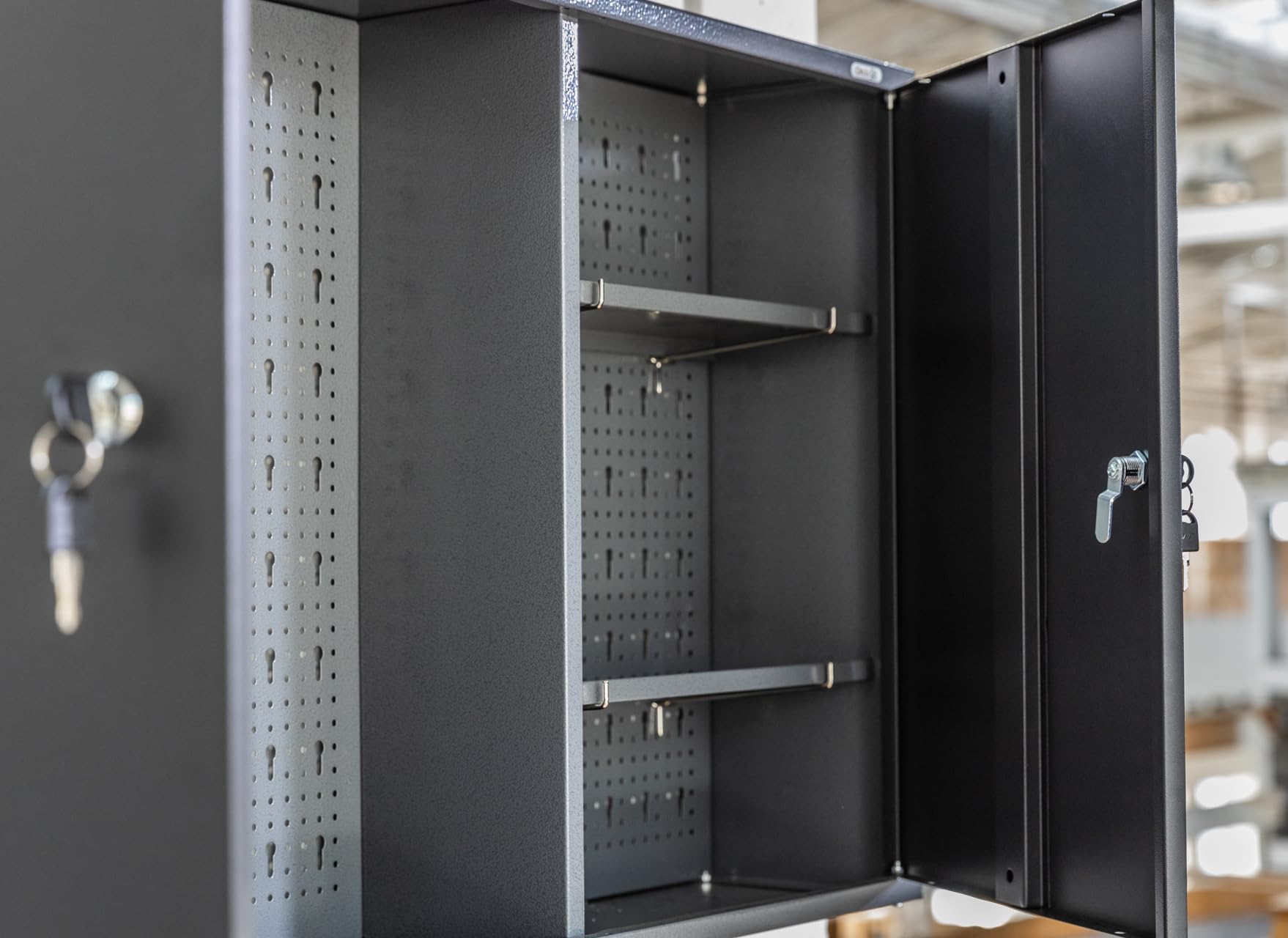 Die abschliessbaren Türen bieten ein entscheidendes Plus an Sicherheit. So können Sie gewiss sein, dass wertvolle Werkzeuge oder gefährliche Gegenstände geschützt und ausser Reichweite von Unbefugten sind. Dies ist ideal für professionelle Betriebe wie Kfz-Werkstätten oder Montagehallen, aber auch für den anspruchsvollen Heimwerker.