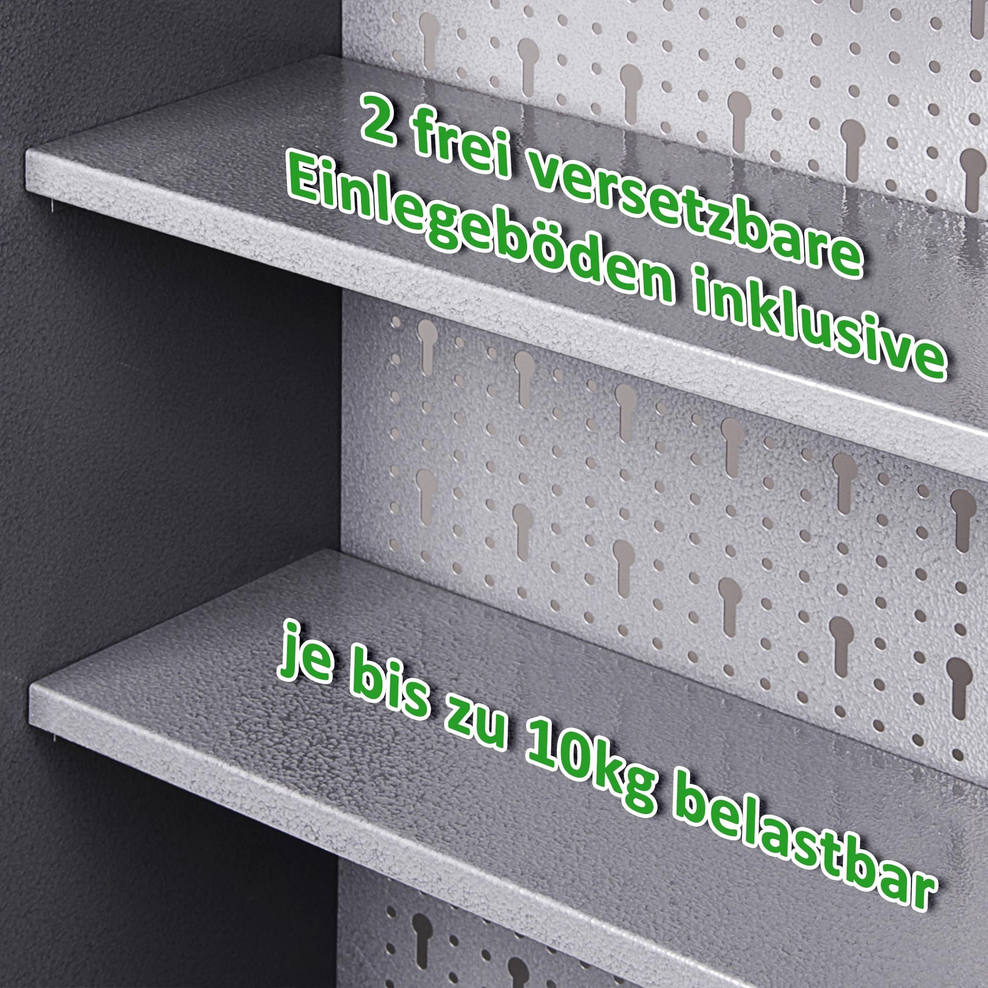 - Flexible Innenaufteilung: In der Höhe verstellbare Einlegeböden und eine integrierte Lochwand für Werkzeughaken ermöglichen eine individuelle Organisation.