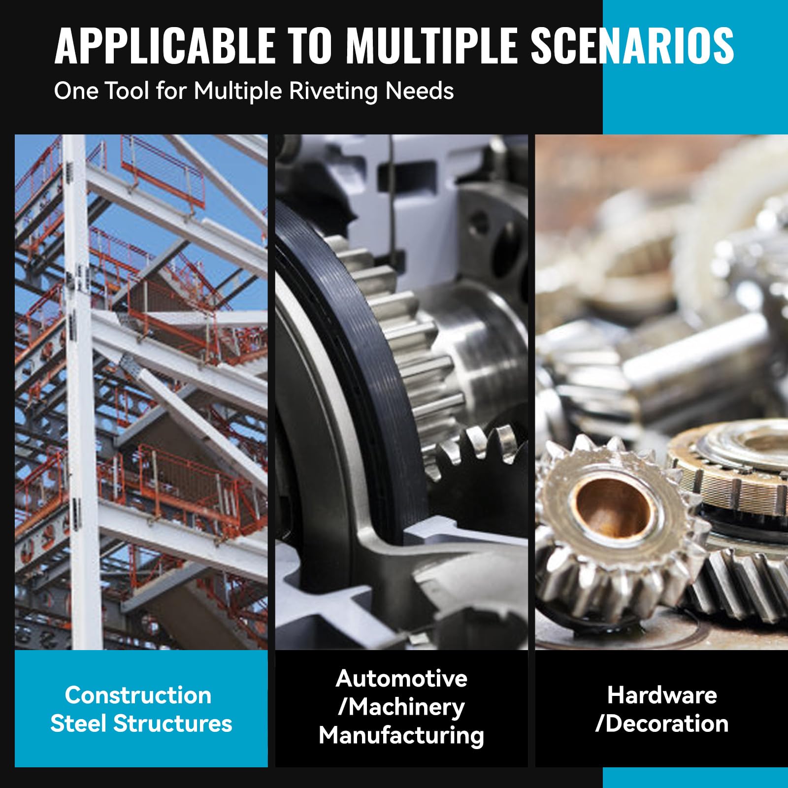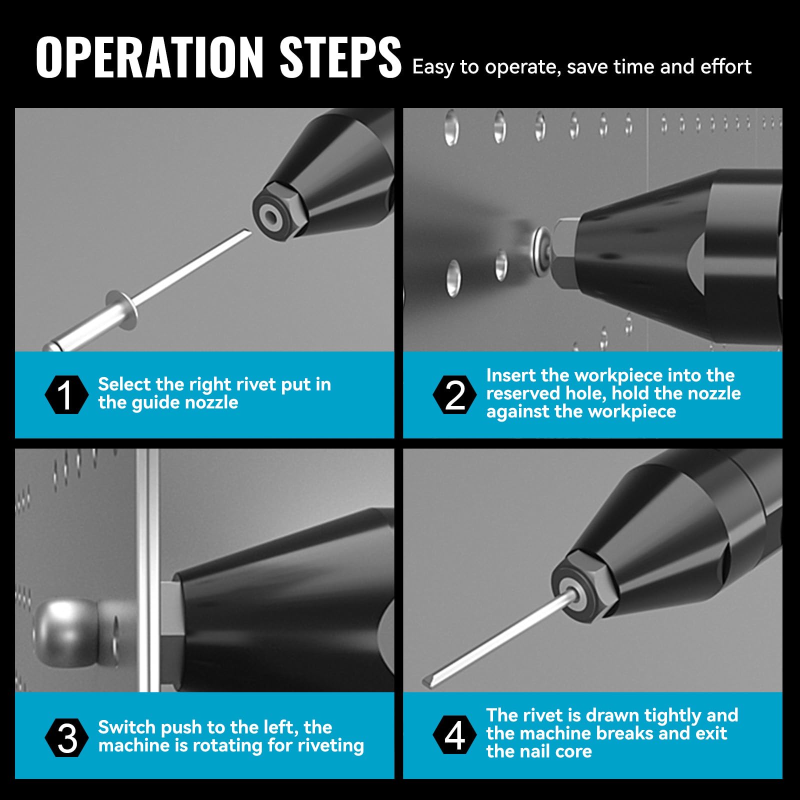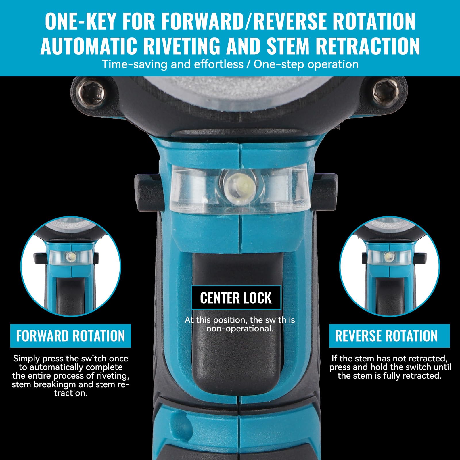 - Effiziente Bedienung: Verfügt über eine Ein-Schritt-Nietfunktion mit automatischem Auswurf des Nietdorns sowie einen Vorwärts- und Rückwärtslauf zum einfachen Lösen von verkeilten Nieten.