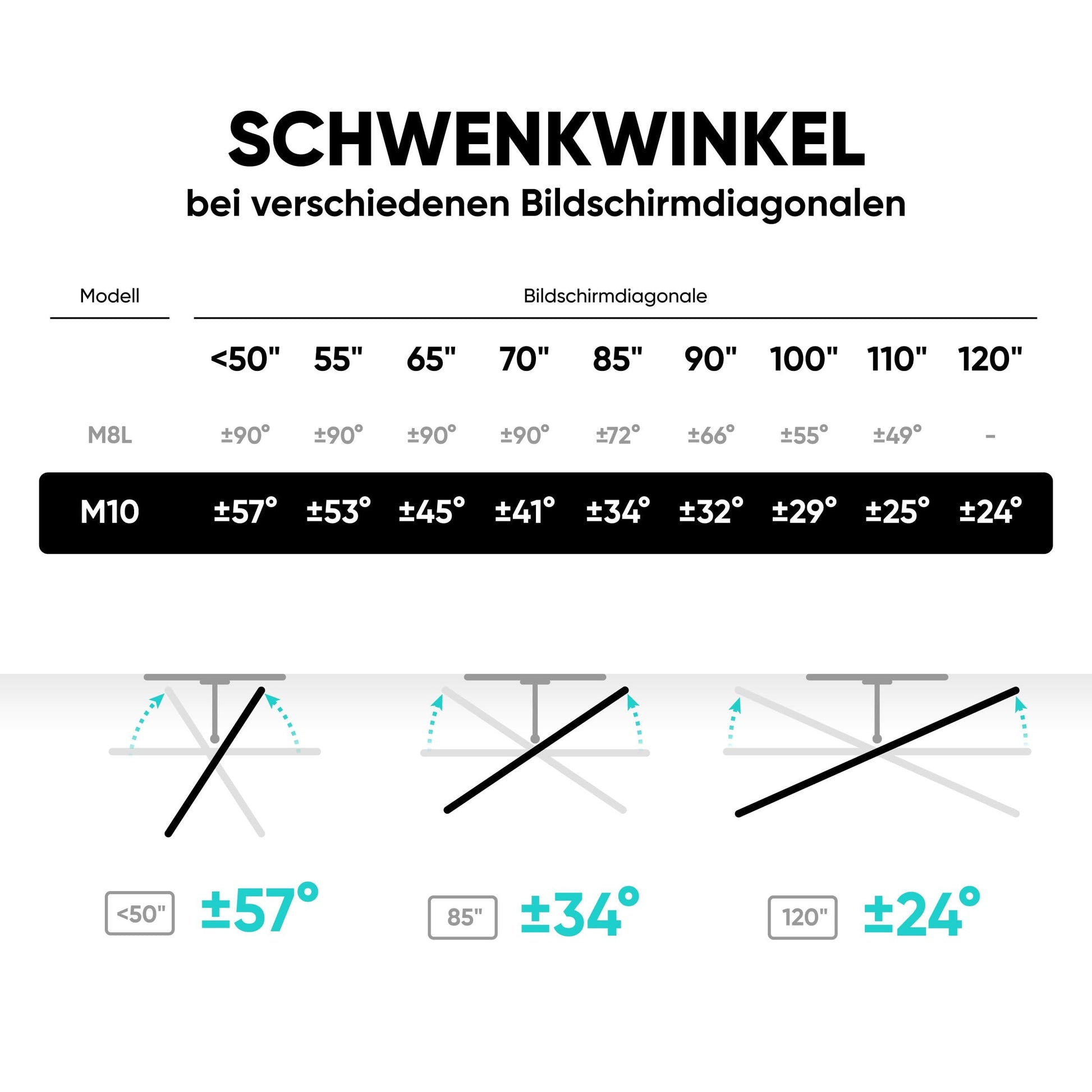 Die M10-B bietet volle Beweglichkeit für den perfekten Blickwinkel. Sie können den Bildschirm um ±45° schwenken, von +9° bis -13° neigen und den Wandabstand stufenlos zwischen 9 cm (ultraflach) und 60 cm (voll ausgezogen) einstellen, ideal um Reflexionen zu vermeiden.