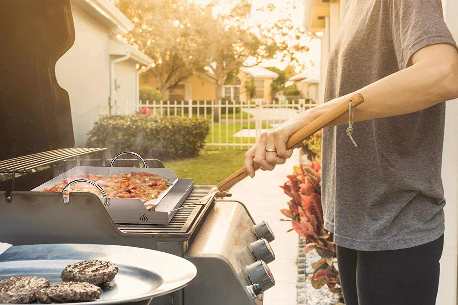 Die geschlossene Oberfläche eröffnet völlig neue Möglichkeiten: Sie können kleines Gemüse, Meeresfrüchte, zarte Fischfilets oder Spiegeleier zubereiten, ohne dass etwas durch den Rost fällt. Sie ist auch ideal für Burger-Patties oder Speck, da das Fett kontrolliert in der integrierten Wanne gesammelt wird.