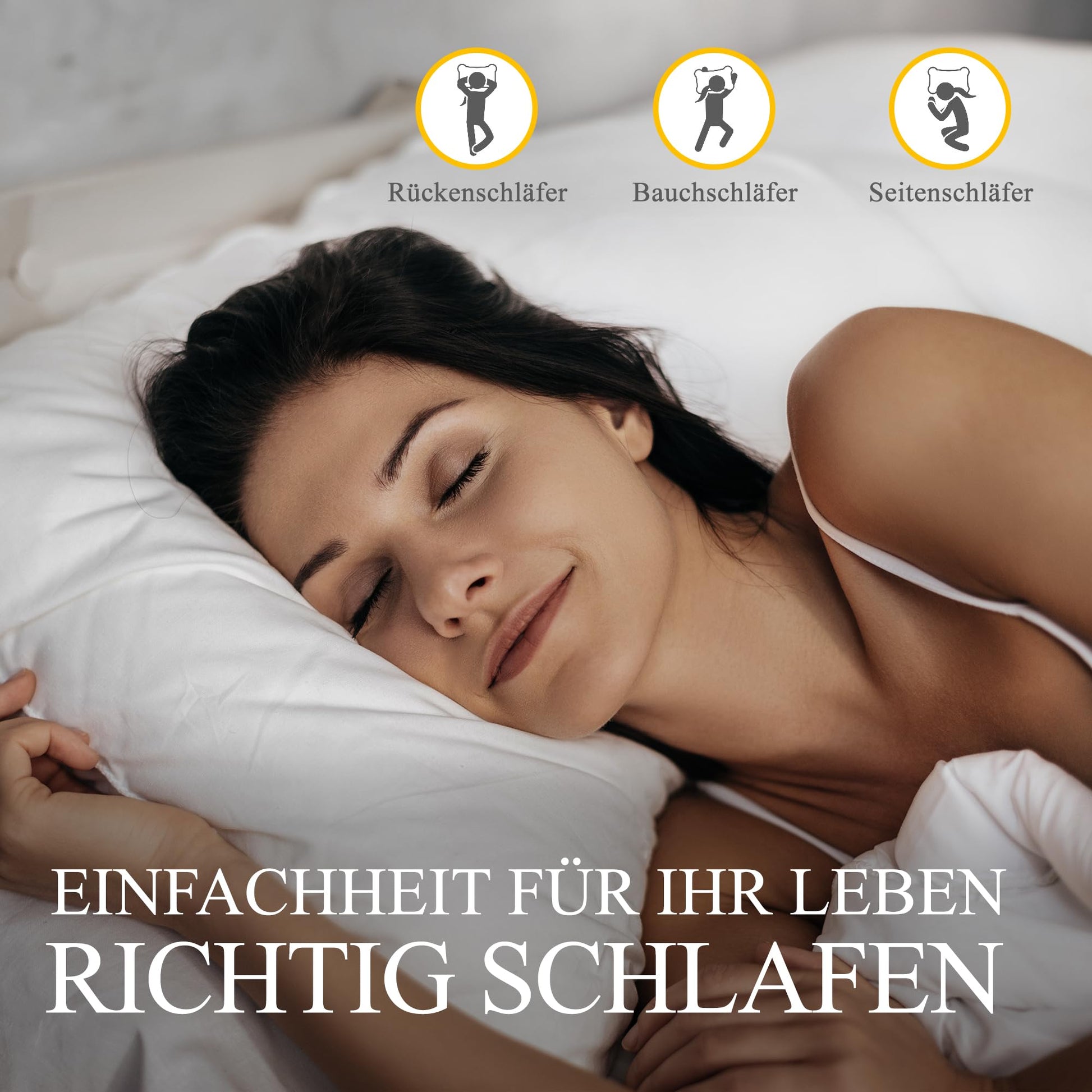 - Stabile Unterstützung durch 3-Kammer-System: Der innovative Kern kombiniert stützende Federn mit weichen Daunen und anpassungsfähiger Mikrofaser. Diese Struktur bietet eine hervorragende ergonomische Stützkraft und sorgt für ein entspanntes Aufwachen, ideal für Seiten- und Rückenschläfer.