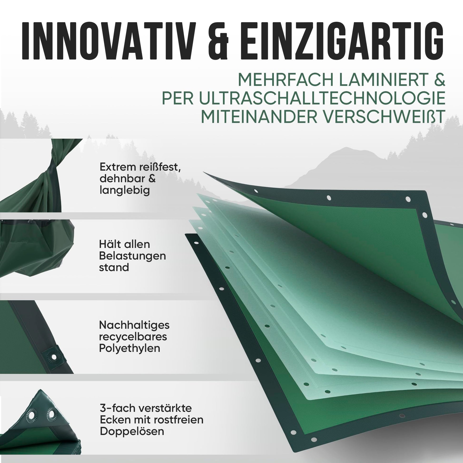 Die ausserordentliche Reissfestigkeit wird durch eine patentierte Laminiertechnologie erreicht, die mehrere Schichten fest miteinander verschweisst. Zusätzlich sind die Ecken dreifach verstärkt und mit je zwei rostfreien Ösen ausgestattet, um ein Ausreissen zu verhindern und eine lange Lebensdauer zu garantieren.