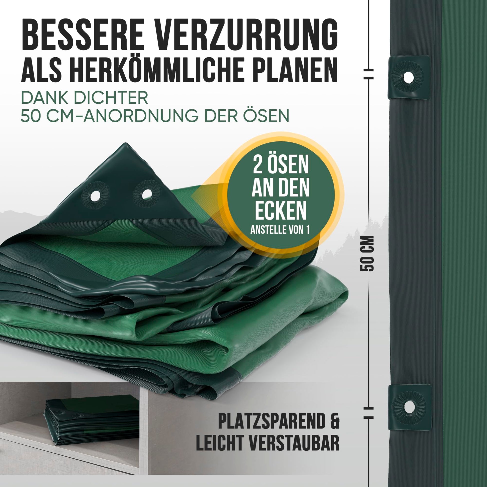 - Absolut wetterfest: Die Plane ist zu 100% wasserdicht und UV-beständig. Wetterfeste Metallösen im praktischen 50-cm-Abstand ermöglichen eine einfache und sichere Befestigung bei jeder Witterung.