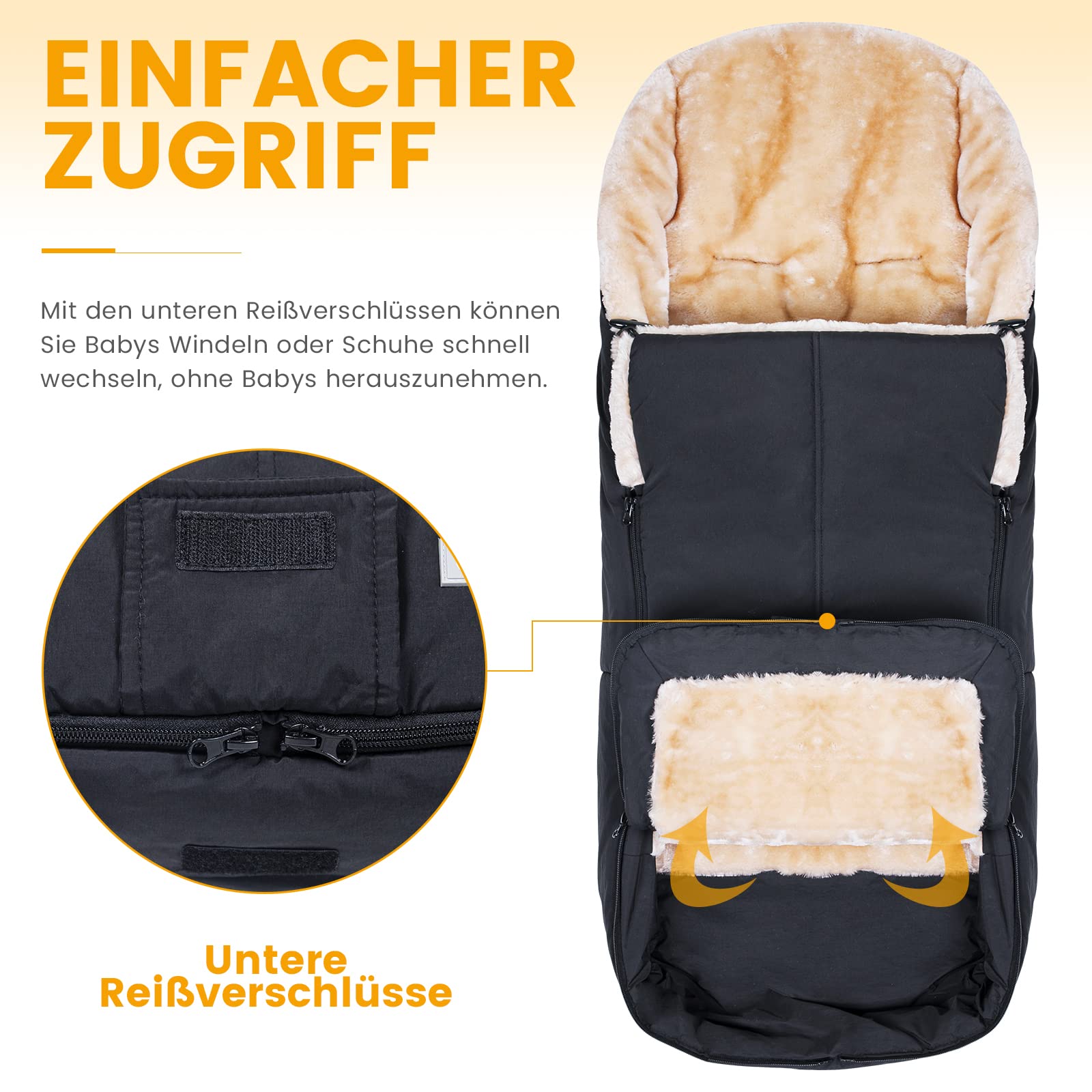Das weiche, künstliche Lammfell hält Ihr Kind nicht nur aussergewöhnlich warm, sondern fördert durch seine Elastizität auch die Mikrozirkulation und sorgt für ein besonders behagliches Gefühl. Das intelligente Design mit dem Zwei-Wege-Reissverschluss macht das Hineinlegen und Herausnehmen des Babys zum Kinderspiel. Zudem können Sie am Fussende den Reissverschluss öffnen, um schmutzige Schuhe draussen zu lassen oder die Windeln zu wechseln, ohne Ihr Kind komplett aufdecken zu müssen.