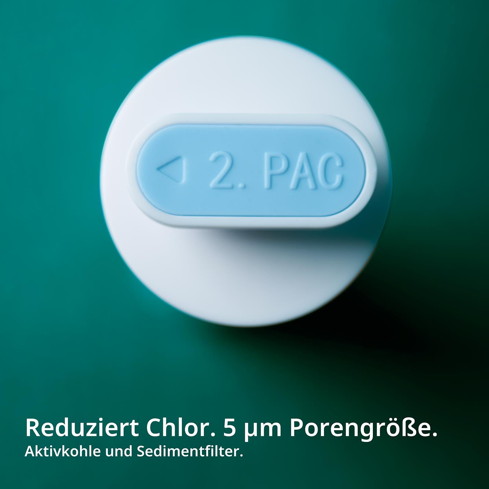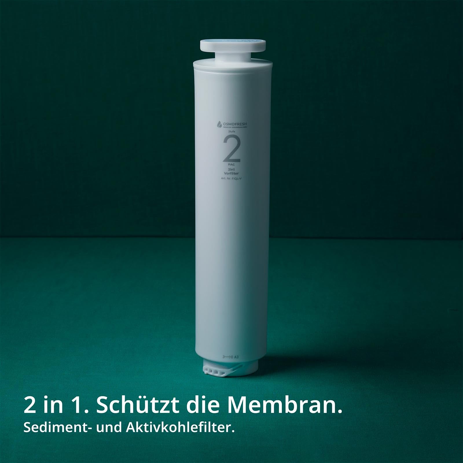 - Leistungsstarker 2-in-1-Vorfilter: Eine Kombination aus einem feinen Sedimentfilter aus Polypropylenfasern und hochwertiger Aktivkohle schützt die nachfolgende Osmosemembran zuverlässig vor Schwebstoffen und Chlor.
