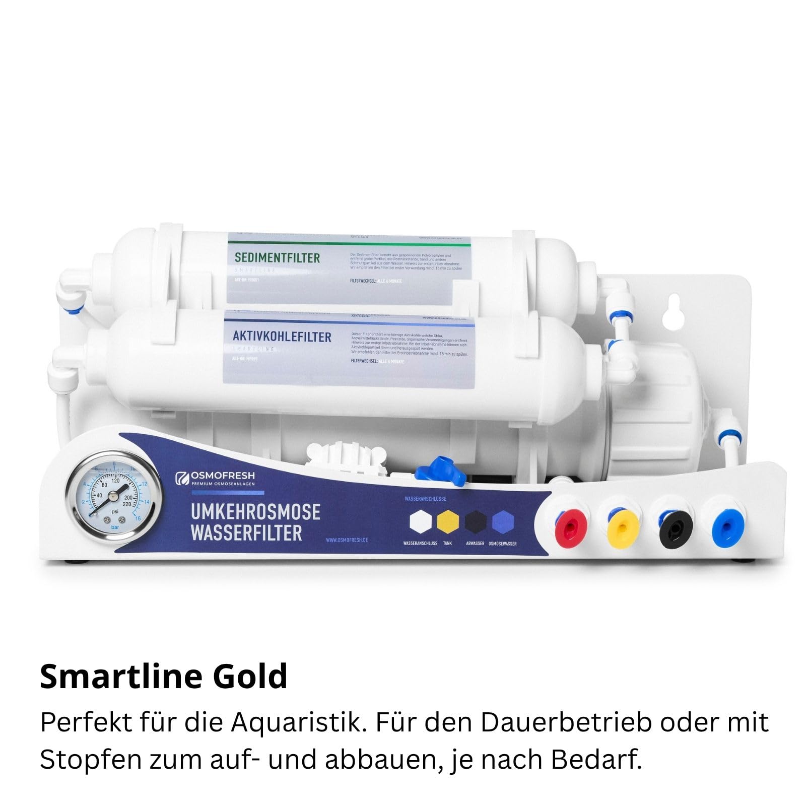 Die OsmoFresh Smartline Gold ist eine professionelle Umkehrosmoseanlage, die speziell für die anspruchsvollen Bedürfnisse der Aquaristik und Meerwasseraquaristik entwickelt wurde. Sie liefert reinstes Wasser direkt aus der Leitung, ganz ohne Speichertank.