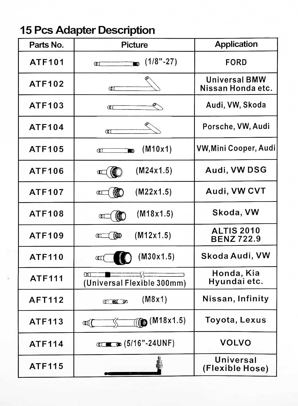Dank der 15 mitgelieferten Adapter bietet dieses Einfüllgerät eine aussergewöhnliche Kompatibilität mit einer Vielzahl von Fahrzeuggetrieben. Sie haben somit für fast jedes Modell den passenden Anschluss zur Hand.