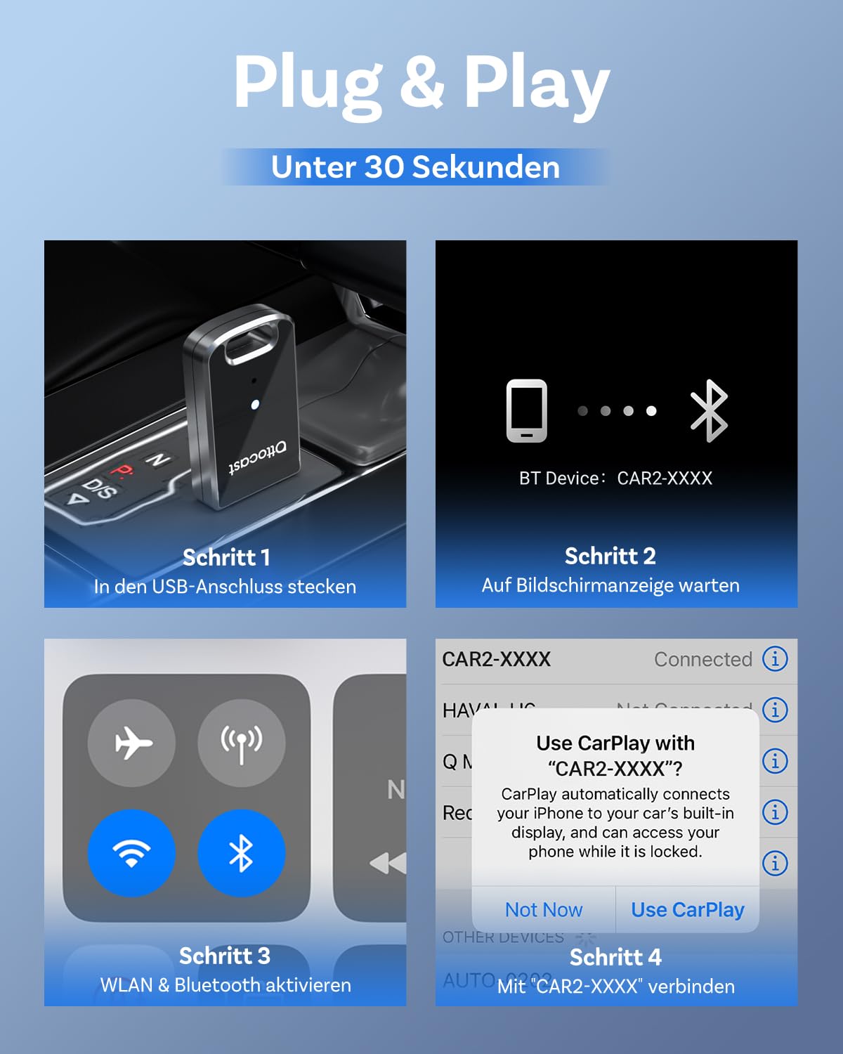 Die Installation ist kinderleicht nach dem Plug-&-Play-Prinzip. Sie stecken den Adapter einfach in den USB-Port Ihres Autos, koppeln Ihr Handy einmalig über Bluetooth, und danach verbindet er sich bei jedem Start automatisch. Alle originalen Bedienelemente Ihres Fahrzeugs, wie Lenkradtasten, Touchscreen und Sprachassistenten, bleiben dabei voll funktionsfähig.