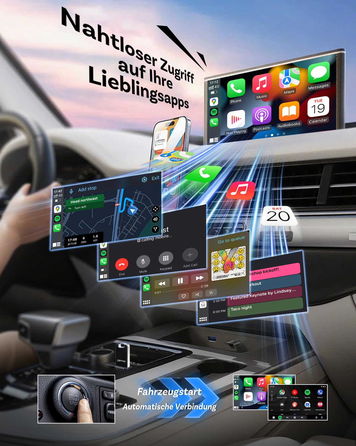 - Volle Fahrzeugintegration: Unterstützt die originalen Bedienelemente Ihres Autos, inklusive Lenkradtasten, Touchscreen und Sprachassistenten wie Siri oder Google Assistant.
