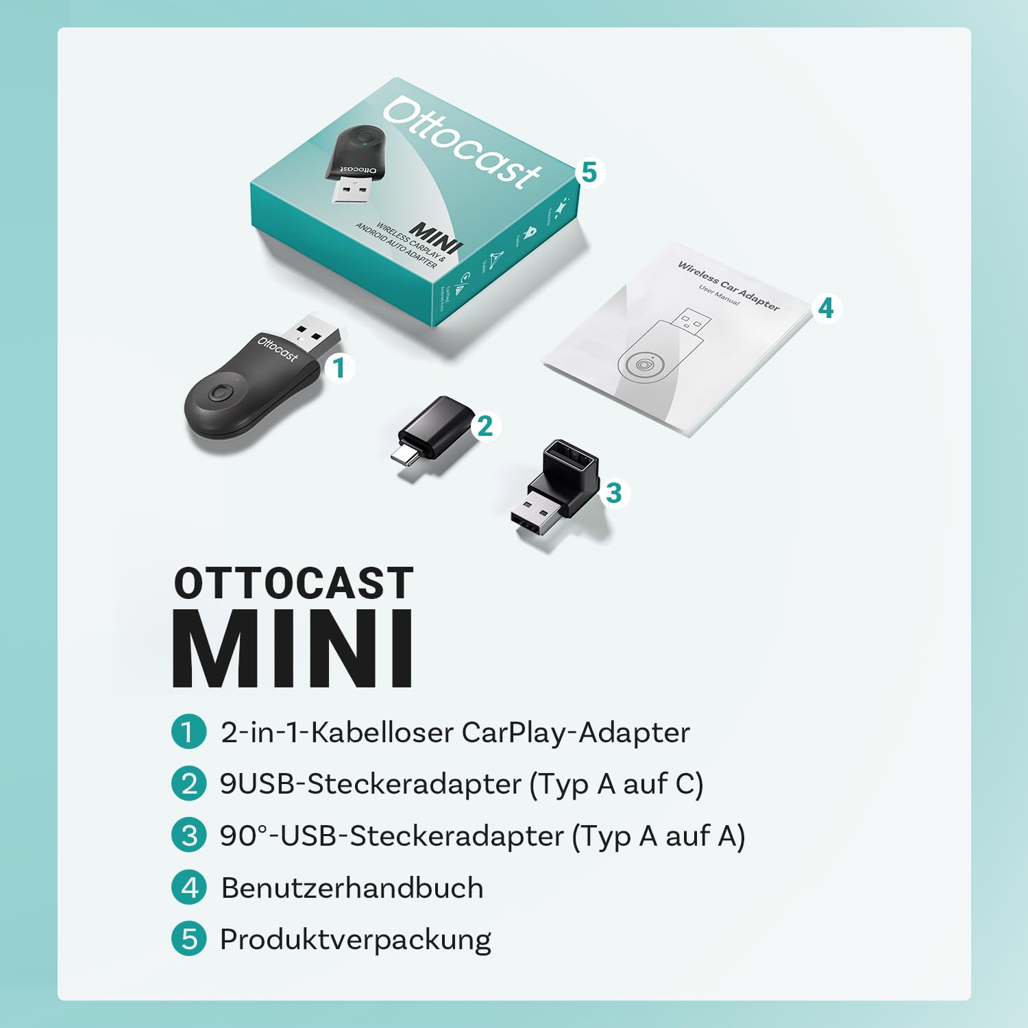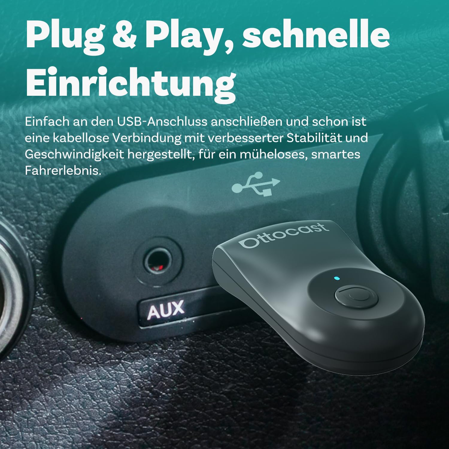 Erleben Sie maximalen Komfort in Ihrem Fahrzeug. Der OTTOCAST Mini Adapter macht Ihr kabelgebundenes Infotainment-System mit einem einfachen Handgriff kabellos und modern, egal ob Sie ein iPhone oder ein Android-Smartphone nutzen.