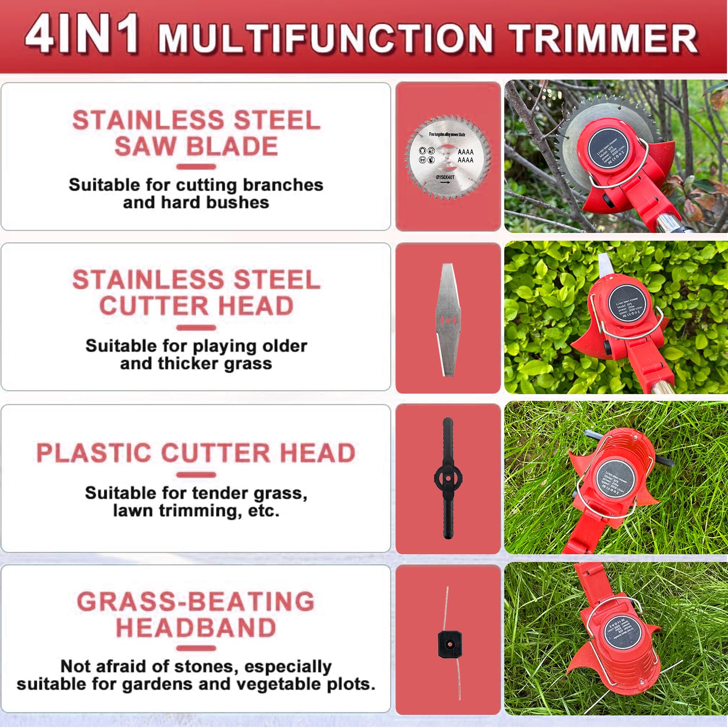 Das vielseitige 4-Klingen-System ist für unterschiedlichste Anforderungen ausgelegt: Das Sägeblatt eignet sich ideal für kleine Äste, die geraden Klingen und die rechtwinklige Klinge sind perfekt für hartnäckiges Unkraut und dichteres Gestrüpp, während die Kunststoffklingen und Rasenkabel für das präzise Schneiden von Rasenkanten und feinerem Gras konzipiert sind.