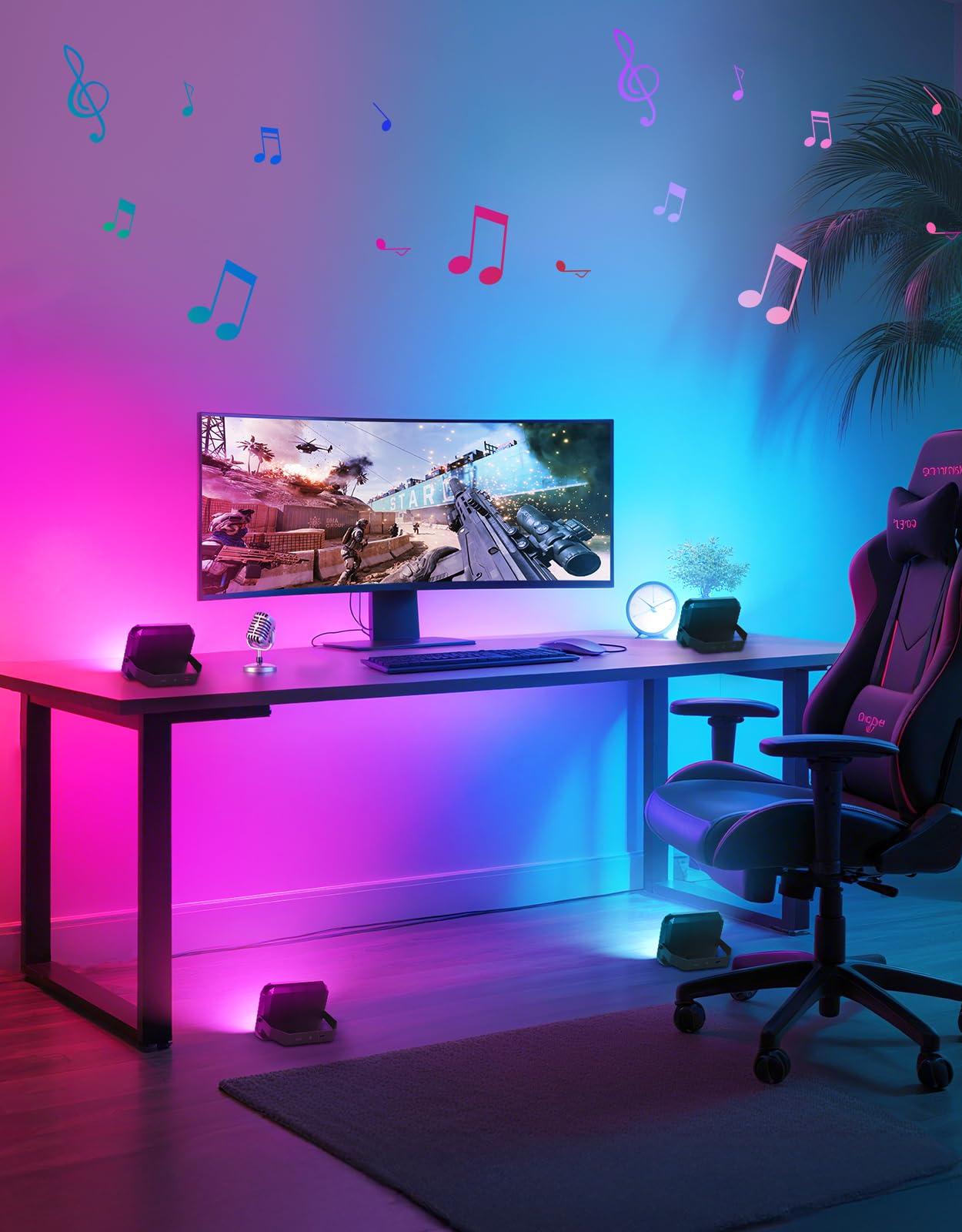 - Dynamische Lichteffekte: Synchronisiert die Farbwechsel in Echtzeit mit Musik und bietet 44 voreingestellte Szenenmodi sowie die Möglichkeit, eigene Lichtszenarien zu kreieren.