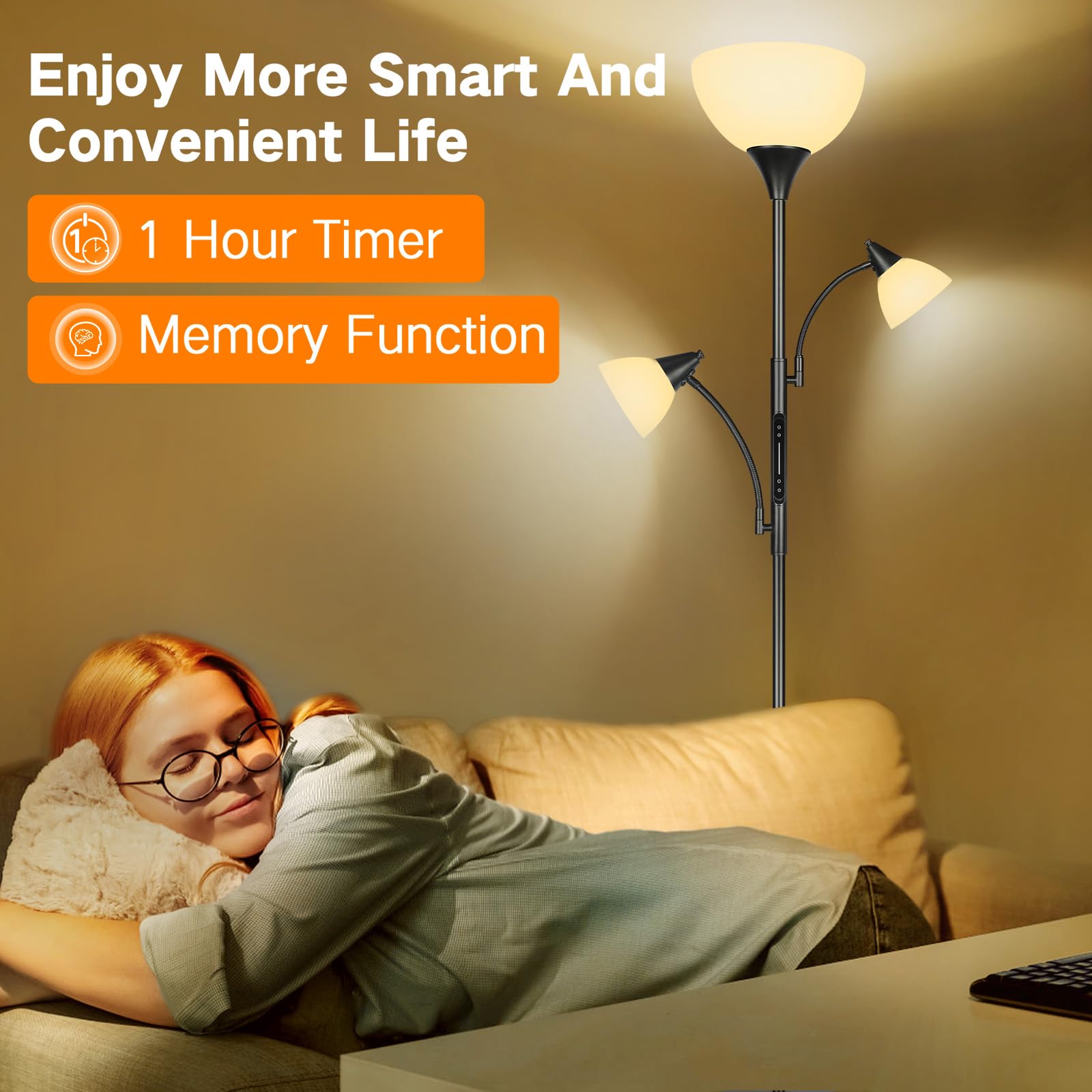 Die Stehlampe verfügt über eine praktische Speicherfunktion, die sich Ihre zuletzt genutzte Einstellung für Helligkeit und Farbtemperatur merkt. Zudem ist ein 1-Stunden-Timer integriert, der die Lampe auf Wunsch automatisch ausschaltet – ideal, wenn Sie sie im Schlafzimmer verwenden.