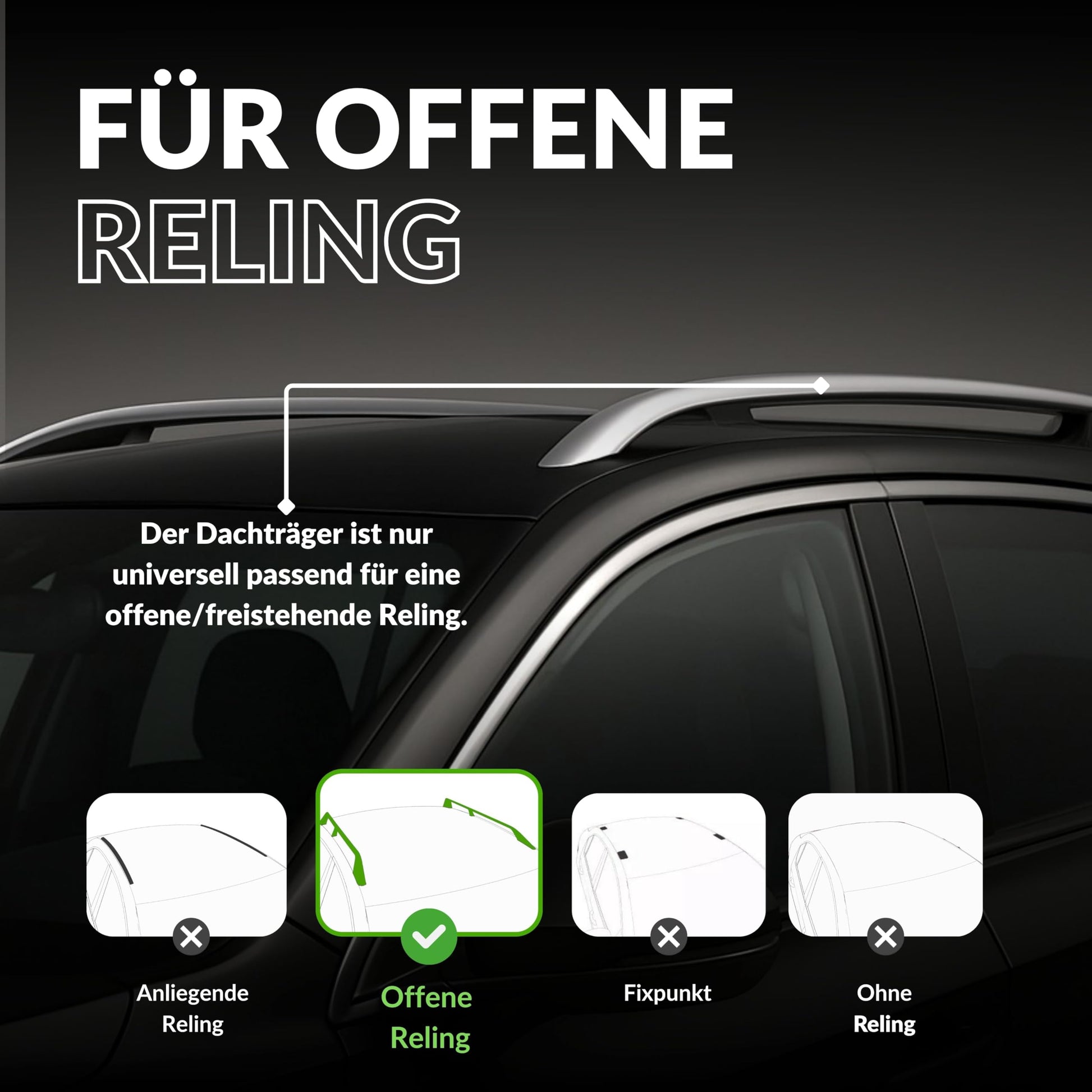 - Universelle Passform: Geeignet für eine grosse Auswahl an Fahrzeugen mit offener, freistehender Dachreling (z.B. SUV, Kombi, Van). Voraussetzung ist ein Relingabstand zwischen 70 und 104 cm.
