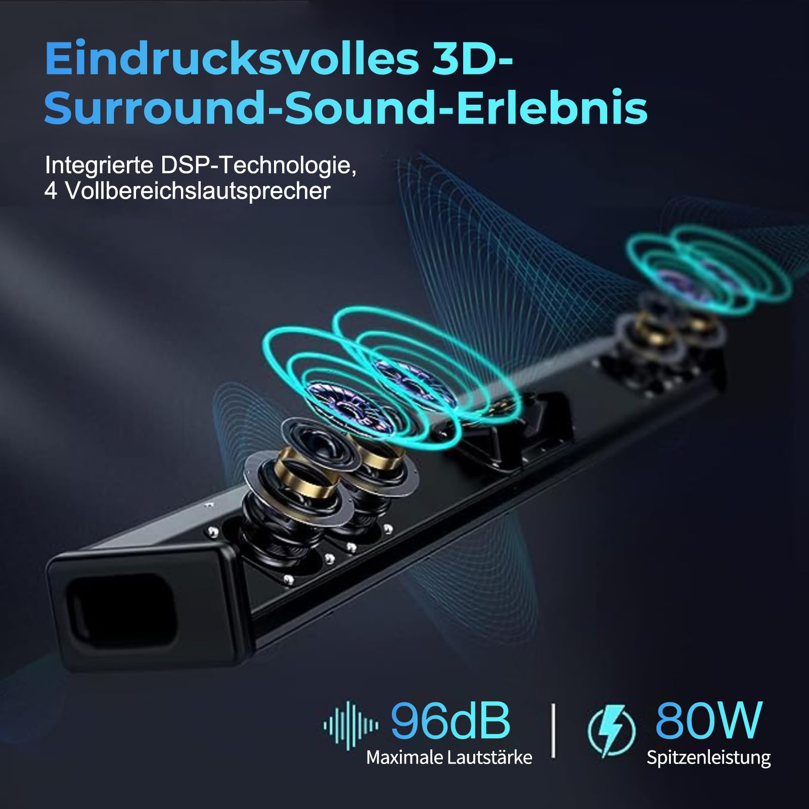- Immersiver 3D-Surround-Sound: Vier Fullrange-Lautsprecher und eine spezielle Bassreflexöffnung erzeugen einen dynamischen, raumfüllenden Klang, der durch digitale Signalverarbeitung (DSP) optimiert wird.