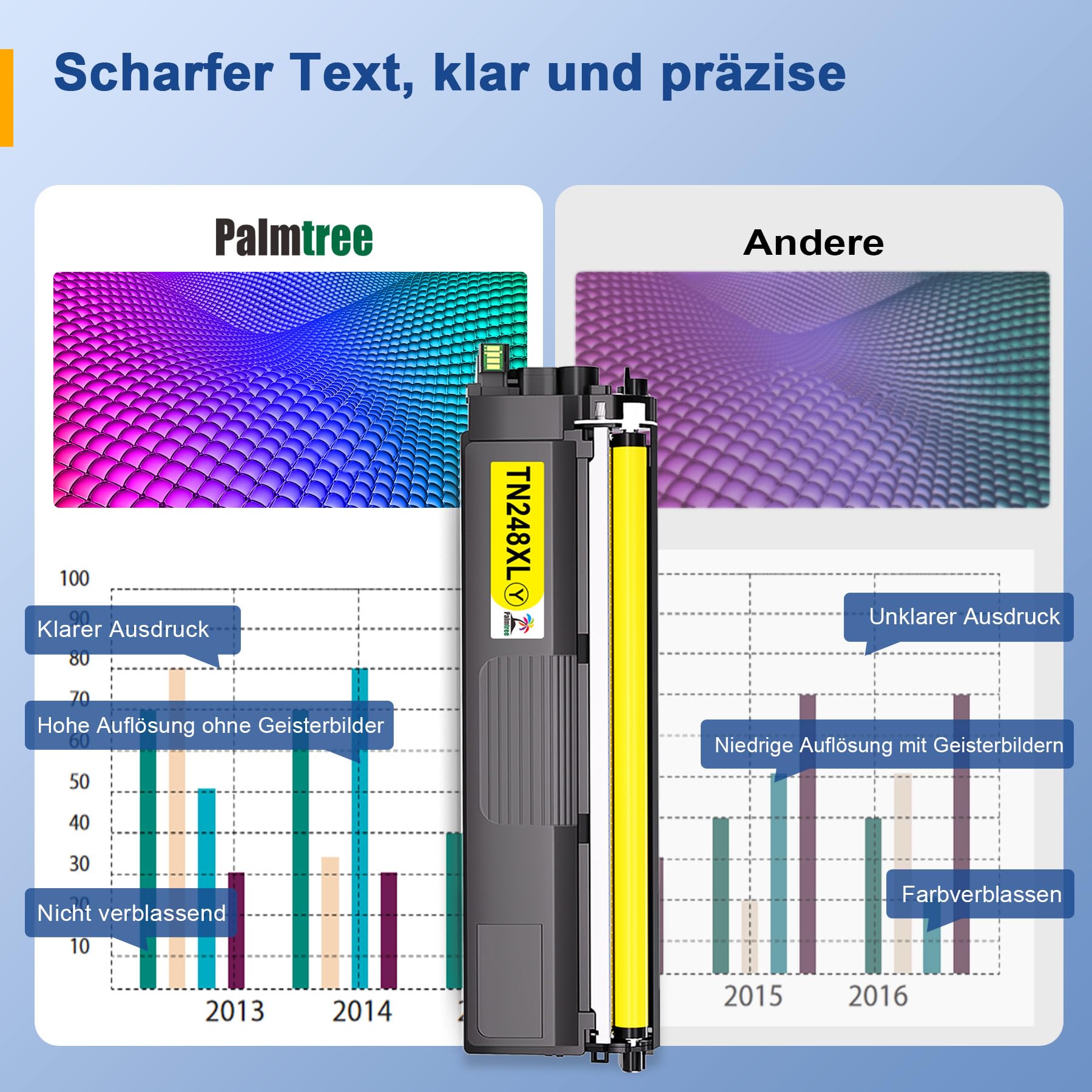 Das Palmtree TN248XL Tonerset wurde entwickelt, um eine herausragende Druckleistung ohne Kompromisse bei der Qualität zu liefern. Sie können professionelle Ergebnisse mit gestochen scharfen Texten und Grafiken sowie lebendigen, leuchtenden Farben erwarten, die es zu einer ausgezeichneten Alternative zum Originalprodukt machen.