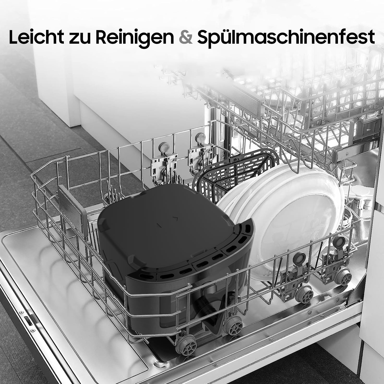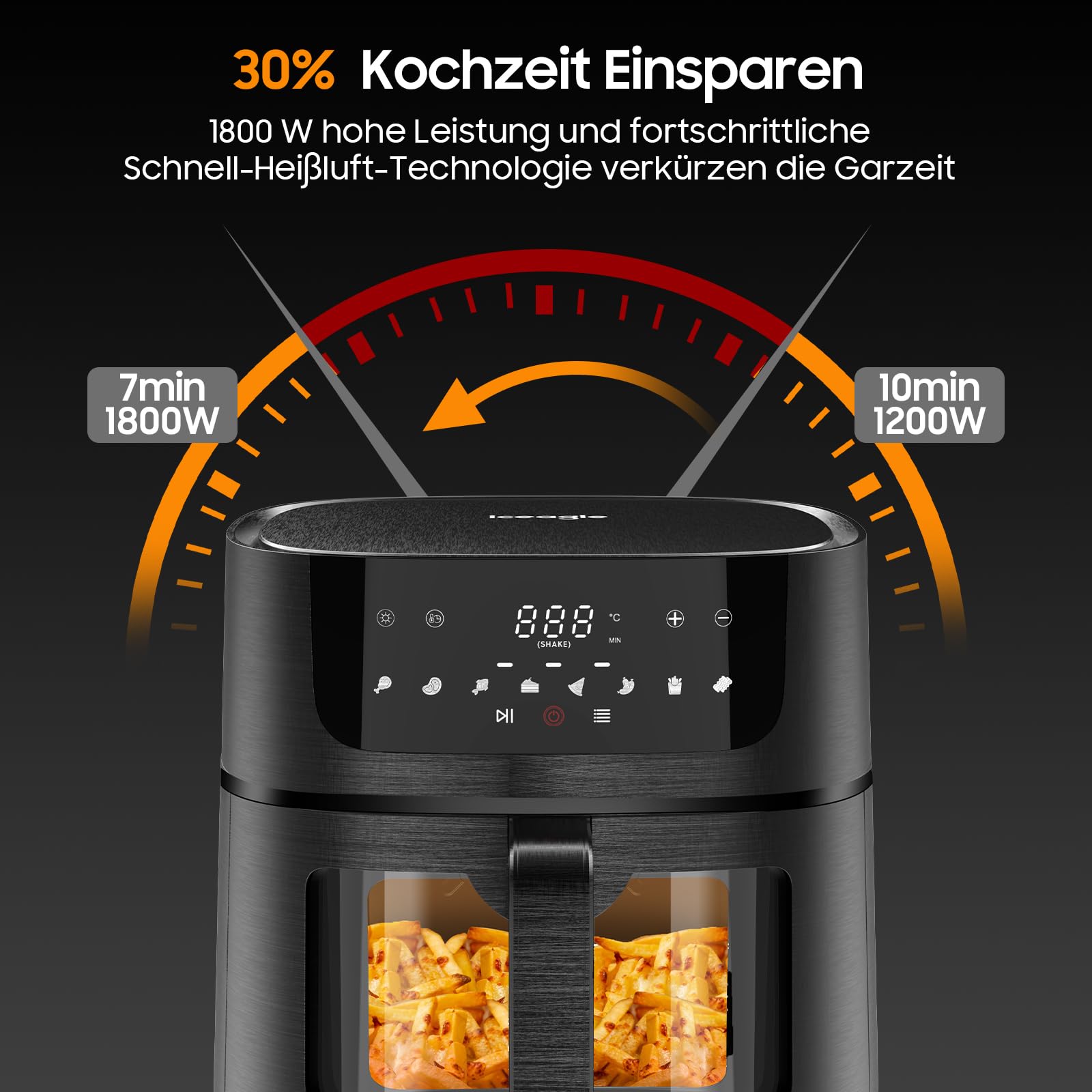 - Digitaler LED-Touchscreen: Wählen Sie aus 8 voreingestellten Programmen für Poulet, Pommes frites, Steak, Fisch und mehr oder stellen Sie die Temperatur (80-200°C) manuell ein.