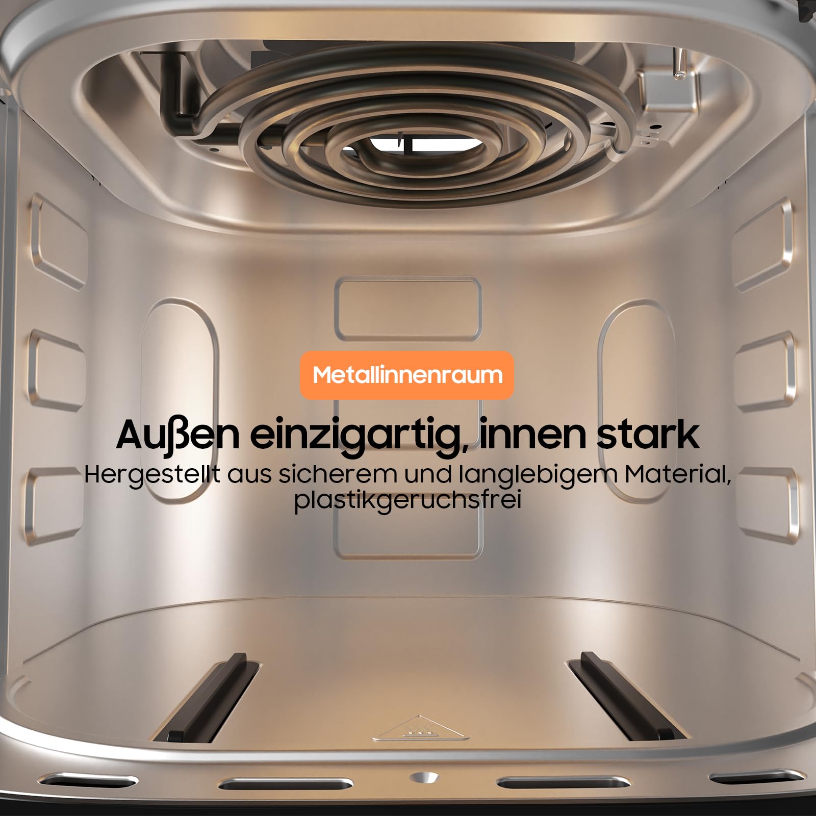 Setzen Sie auf Qualität, die sich bewährt. Der robuste Metall-Innenraum sorgt nicht nur für eine optimale Hitzeverteilung, sondern macht das Gerät auch besonders widerstandsfähig und einfach zu reinigen. Eine Investition, die Ihnen lange Freude bereiten wird.