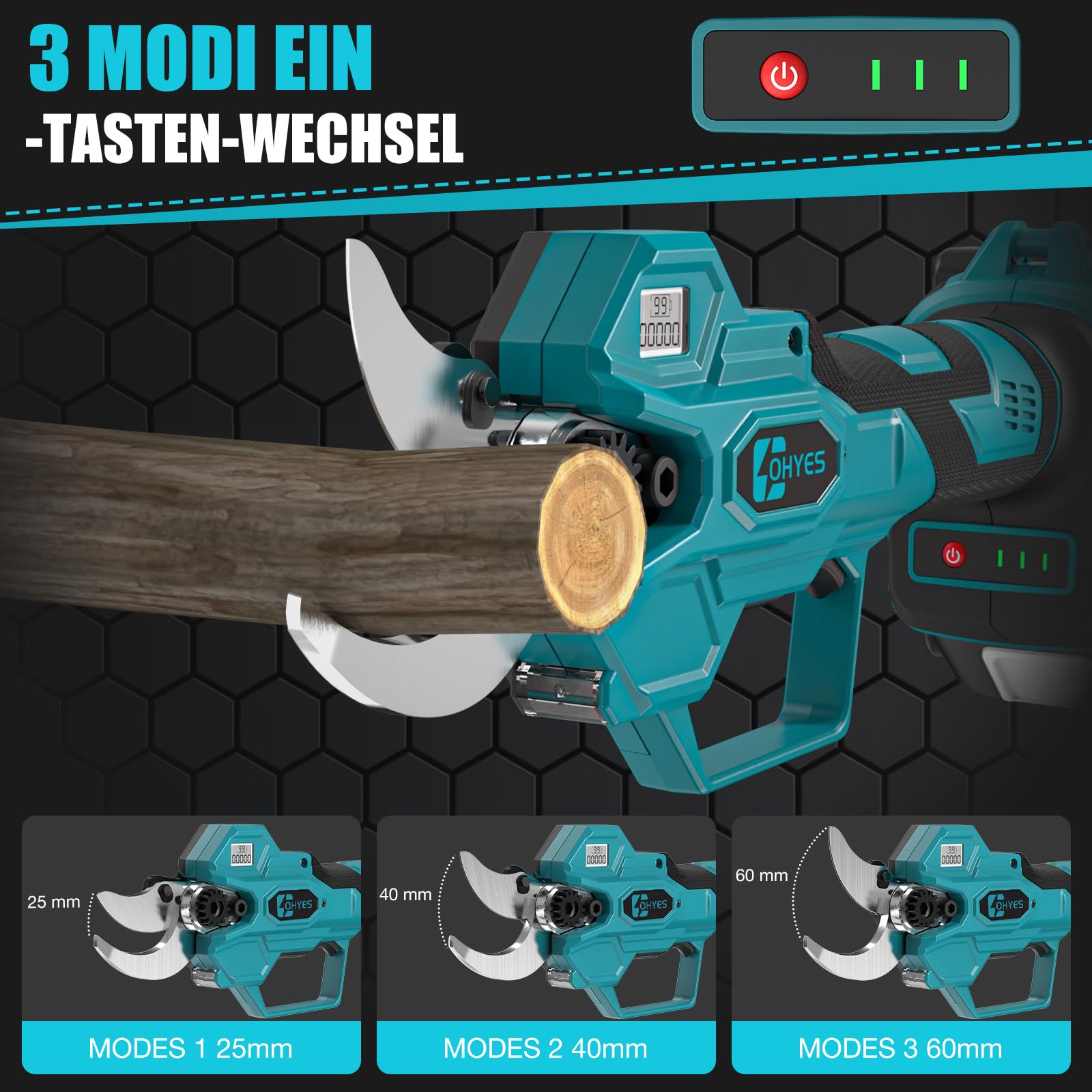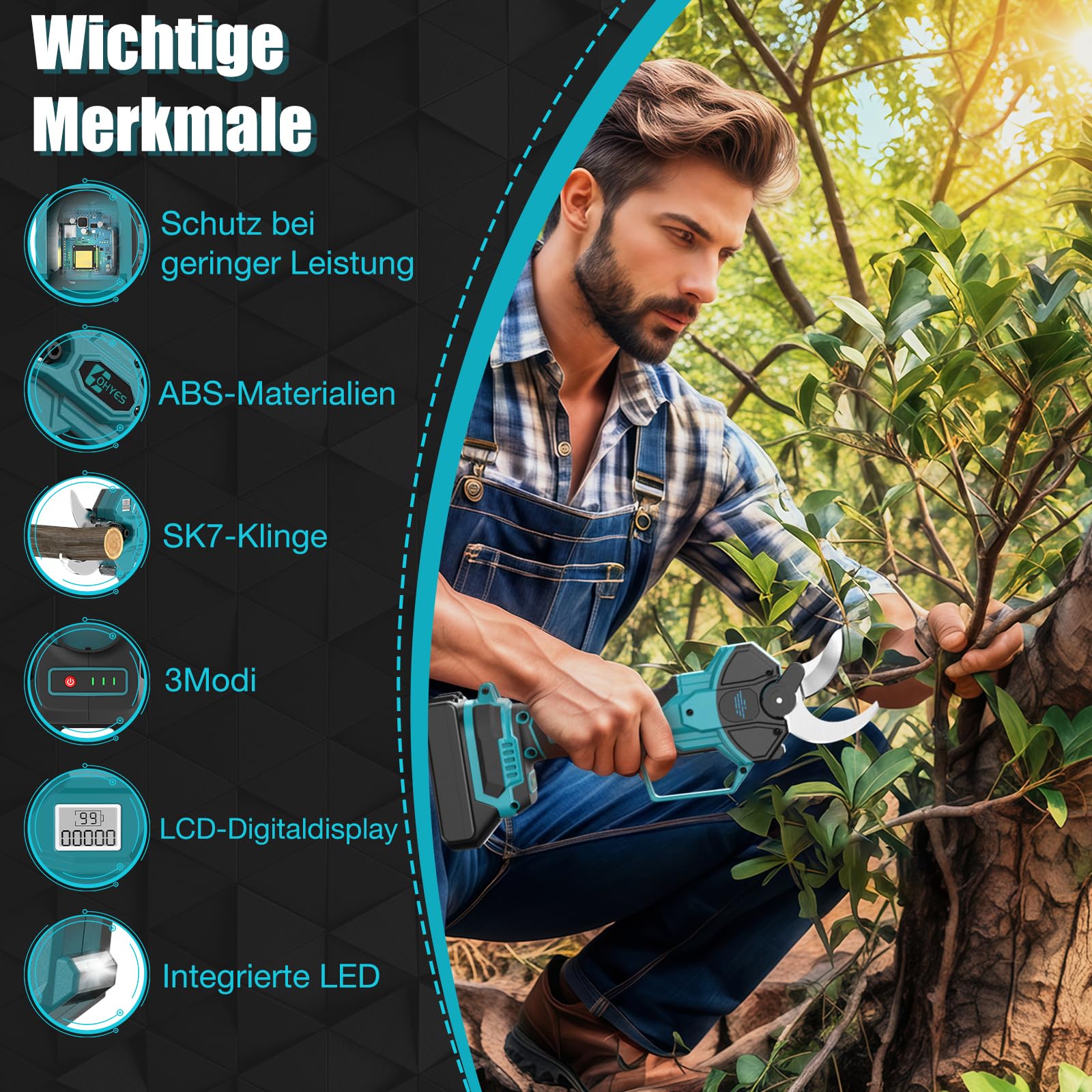 - Sicherheits-Schalter: Ein ergonomisches Design reduziert die Ermüdung bei der Arbeit. Um die Astschere zu aktivieren, muss der Schalter bewusst zweimal gedrückt werden, was ein versehentliches Starten verhindert.