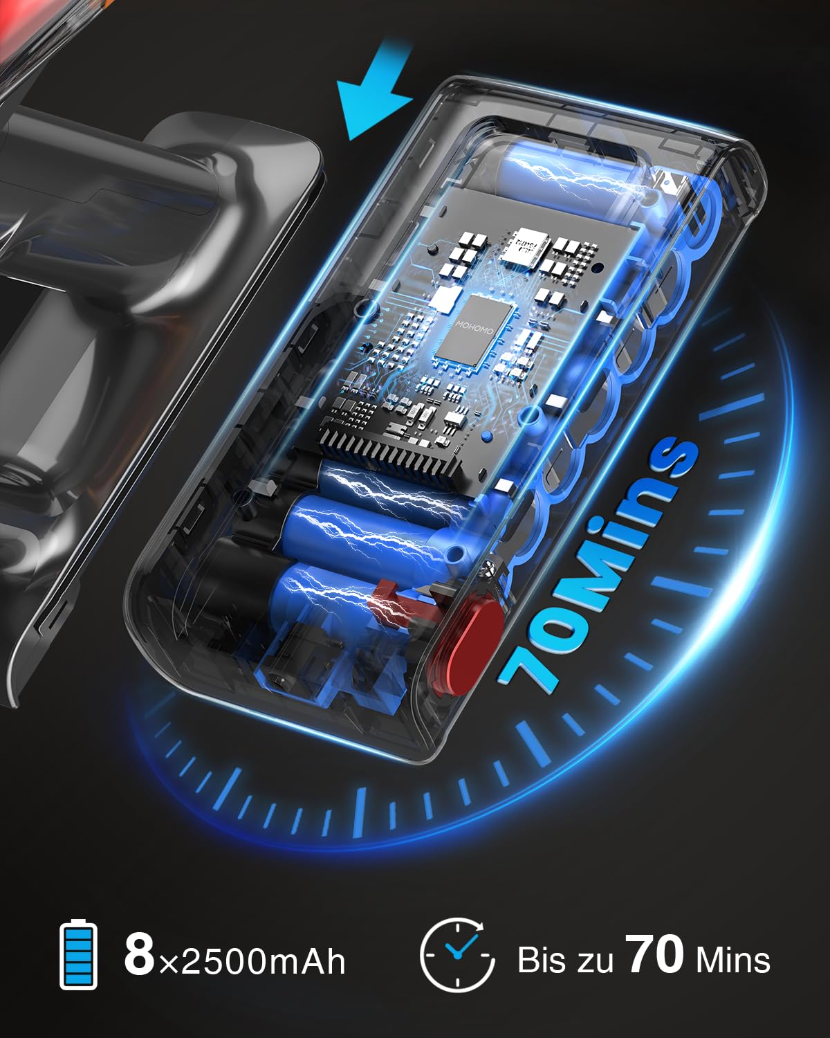 Der herausnehmbare 8-Zellen-Akku ermöglicht eine Reinigungsdauer von bis zu 70 Minuten im Eco-Modus und 30 Minuten bei maximaler Leistung. Da der Akku entnehmbar ist, kann er bei Bedarf einfach ausgetauscht werden, was die Lebensdauer des Geräts verlängert.