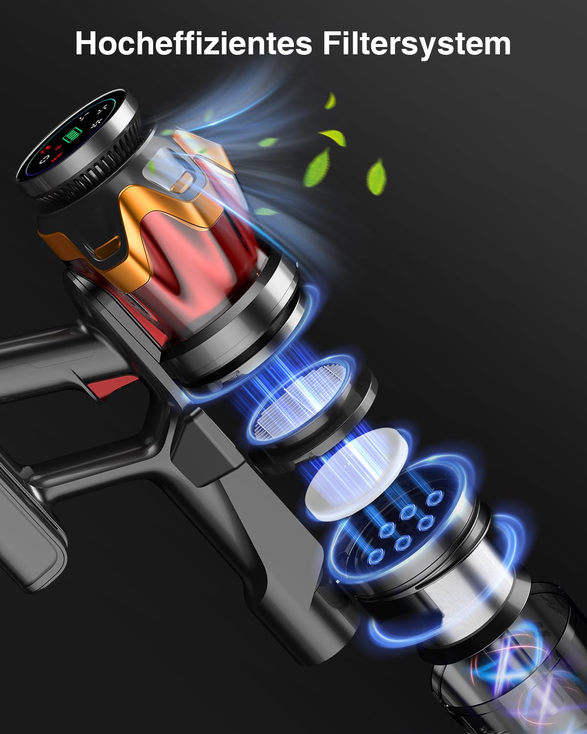 - Intelligentes HD-Display: Ein grosses, farbiges LED-Display mit Touch-Funktion zeigt den Akkustand in Echtzeit an, ermöglicht die einfache Anpassung der Saugstärke und warnt bei Störungen.