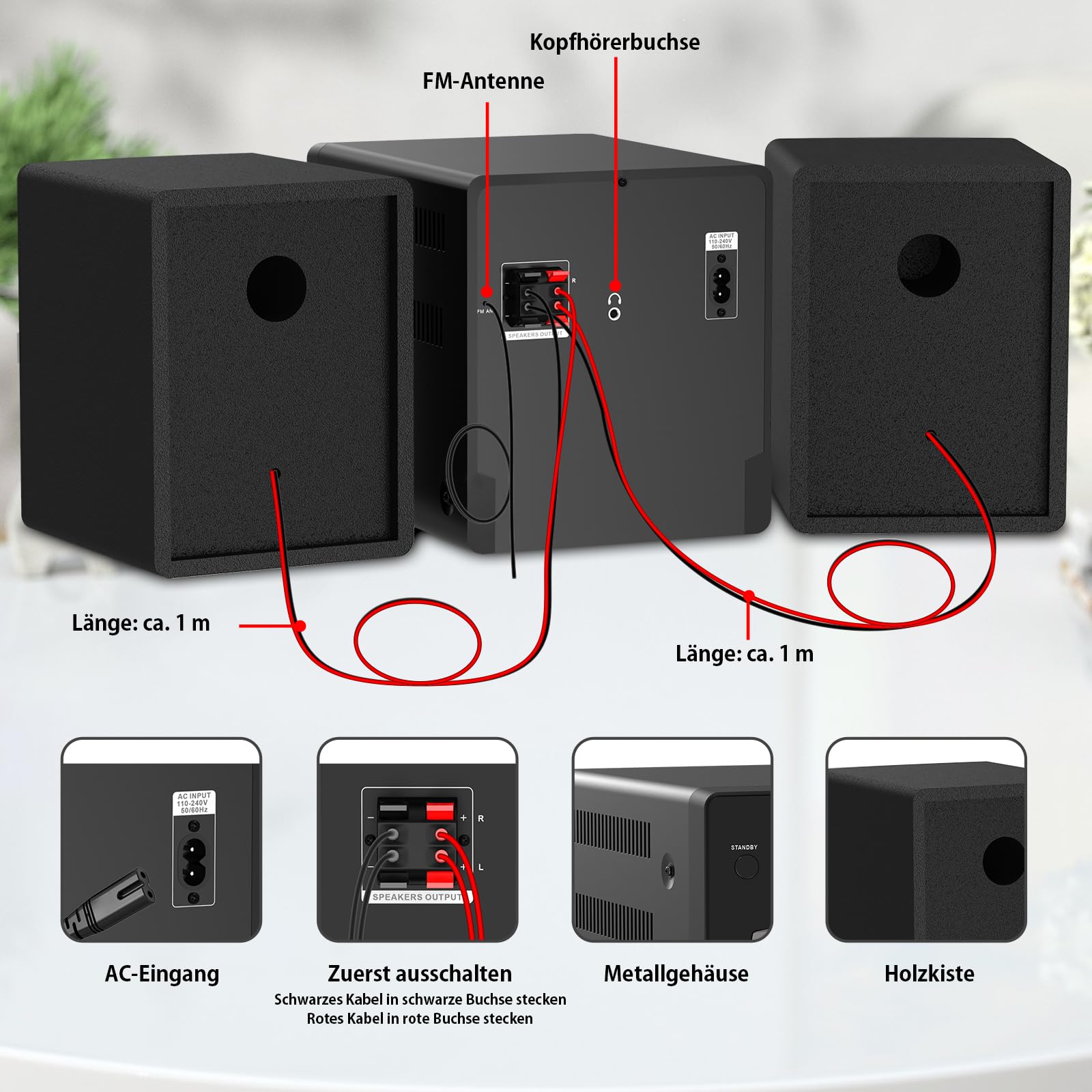 - Vielseitige Wiedergabemöglichkeiten: Spielen Sie Ihre Musik via CD-Player (unterstützt CD, CD-R, CD-RW, MP3), UKW-Radio (87,5 - 108 MHz), Bluetooth-Streaming von Ihrem Smartphone oder Computer, USB-Anschluss (bis 64 GB) oder über den AUX-Eingang (3,5-mm-Klinke).